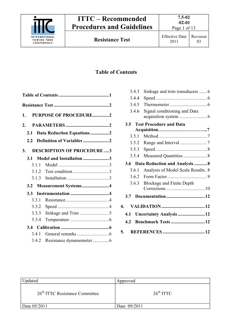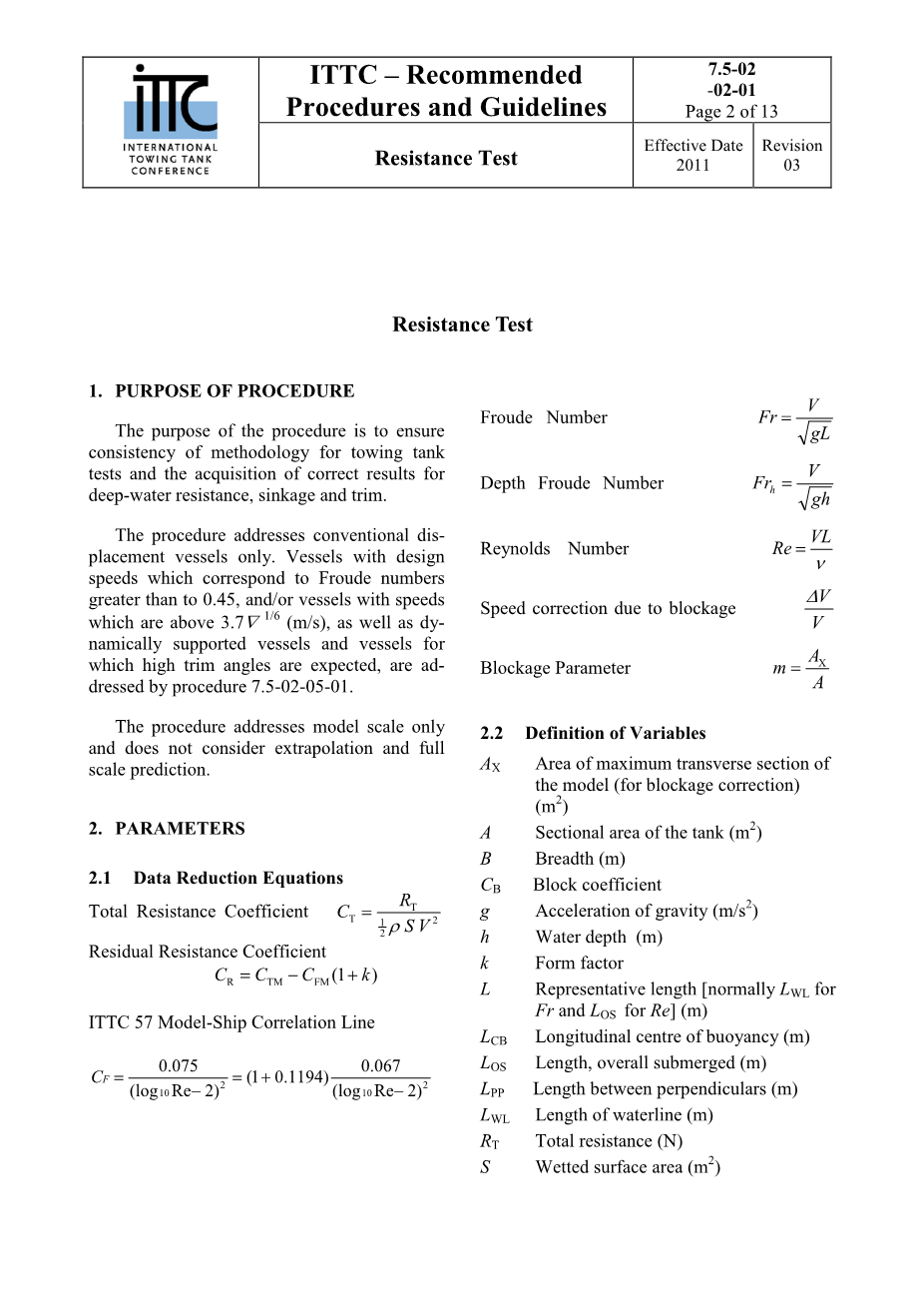 该试验流程的目的是确保拖曳水池试验方法的一致性,并确保获得有关深水条件下的水阻力、升沉和纵倾的正确结果。
