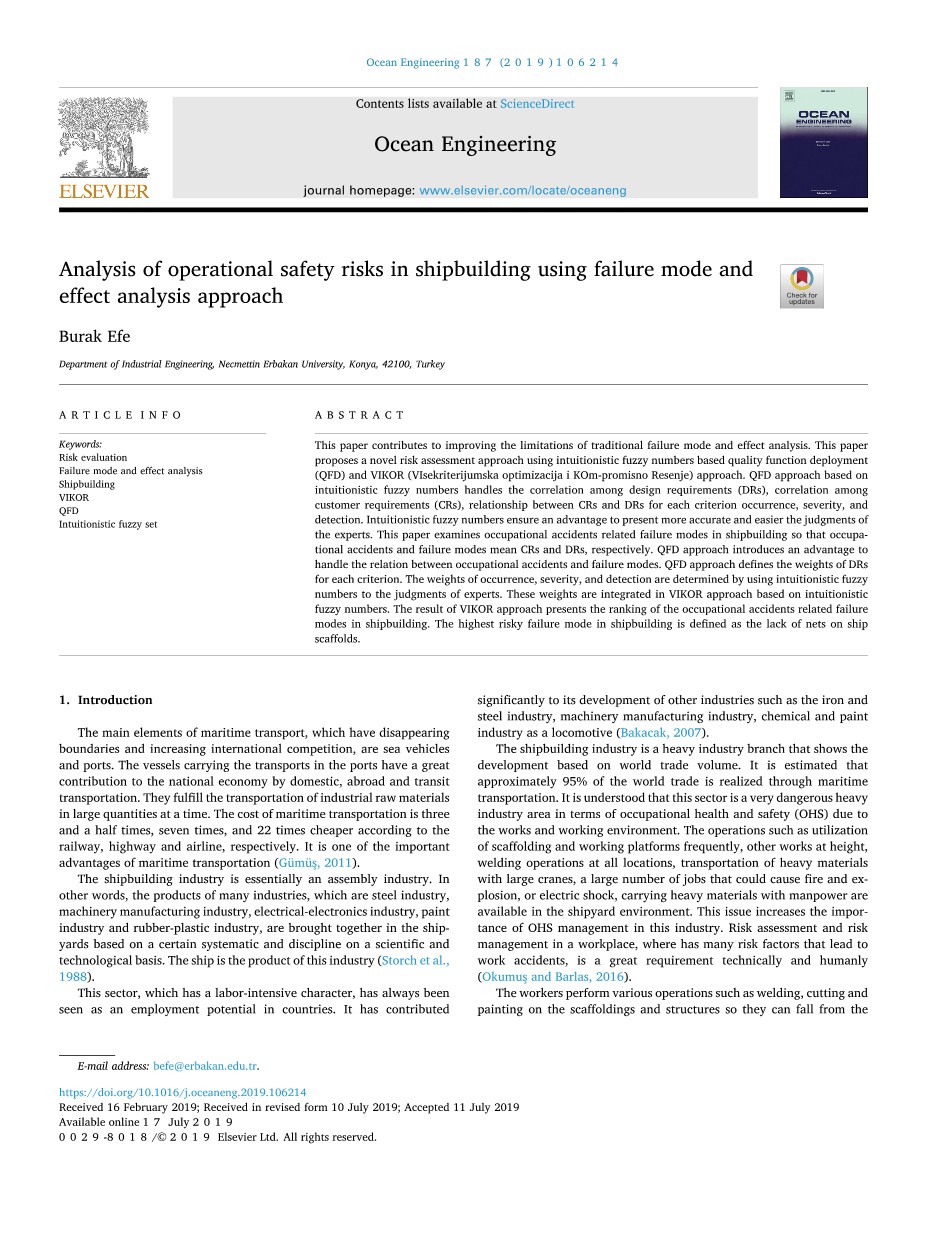 这篇文献致力于改进传统失效模式和失效效果分析的局限性。这篇论文提出了一种基于直觉模糊数的质量函数部署的风险评估方法(QFD)和VIKOR (VIsekriterijumska optimizacija i komi -promisno Resenje)方法。基于直觉模糊数的QFD方法处理设计需求(DRs)之间的相关性,客户需求(CRs)之间的相关性,CRs与DRs之间的关系,针对每个准则的发生、严重程度和检测。直觉模糊数的优点是能更准确、更容易地表达专家的判断。本文探讨了船舶建造过程中与职业事故相关的失效模式事故模式和失效模式分别为CRs和DRs。QFD方法引进了一个很好的方法处理职业性意外事故与失效模式的关系。QFD方法为每个标准定义了DRs的权重。利用直觉模糊数通过专家的判断来确定事故发生、严重程度和检测的权重。基于直觉模糊数的VIKOR方法将这些权重综合起来。VIKOR方法的结果给出了在船舶建造过程中与职业事故相关的失效模式的排序。船舶制造过程中最危险的失效模式被定义船舶支架上没有网。