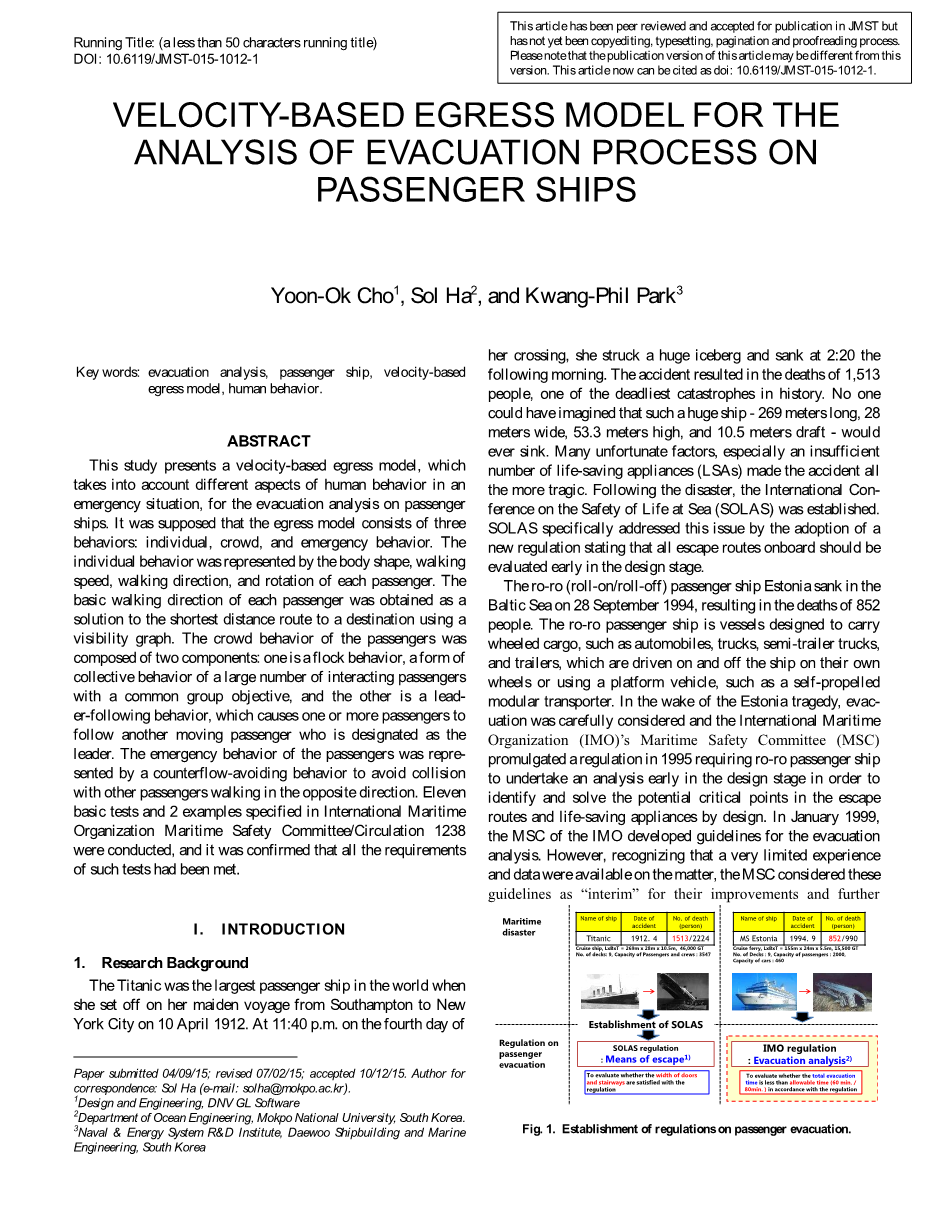 本文提出了一个基于速度的疏散模型,该模型考虑了紧急情况下人类行为的不同方面,用于客船的疏散分析。假设出口模型包括三种行为:个体行为、群体行为和紧急行为。个体行为表现为每个乘客的体形、行走速度、行走方向和旋转角度。利用可视图求出每个乘客的基本步行方向,作为到达目的地的最短距离路线的解。乘客的群体行为由两部分组成:一是群体行为,是大量具有共同群体目标的互动乘客的集体行为形式;二是领导跟随行为,导致一名或多名乘客跟随另一名被指定为领队的移动乘客。乘客的紧急行为表现为逆流避让行为,以避免与其他朝相反方向行走的乘客发生碰撞。进行了11项基本试验和2个国际海事组织海事安全委员会/第1238号文件中规定的实例,并确认这些试验的所有要求均已满足。
