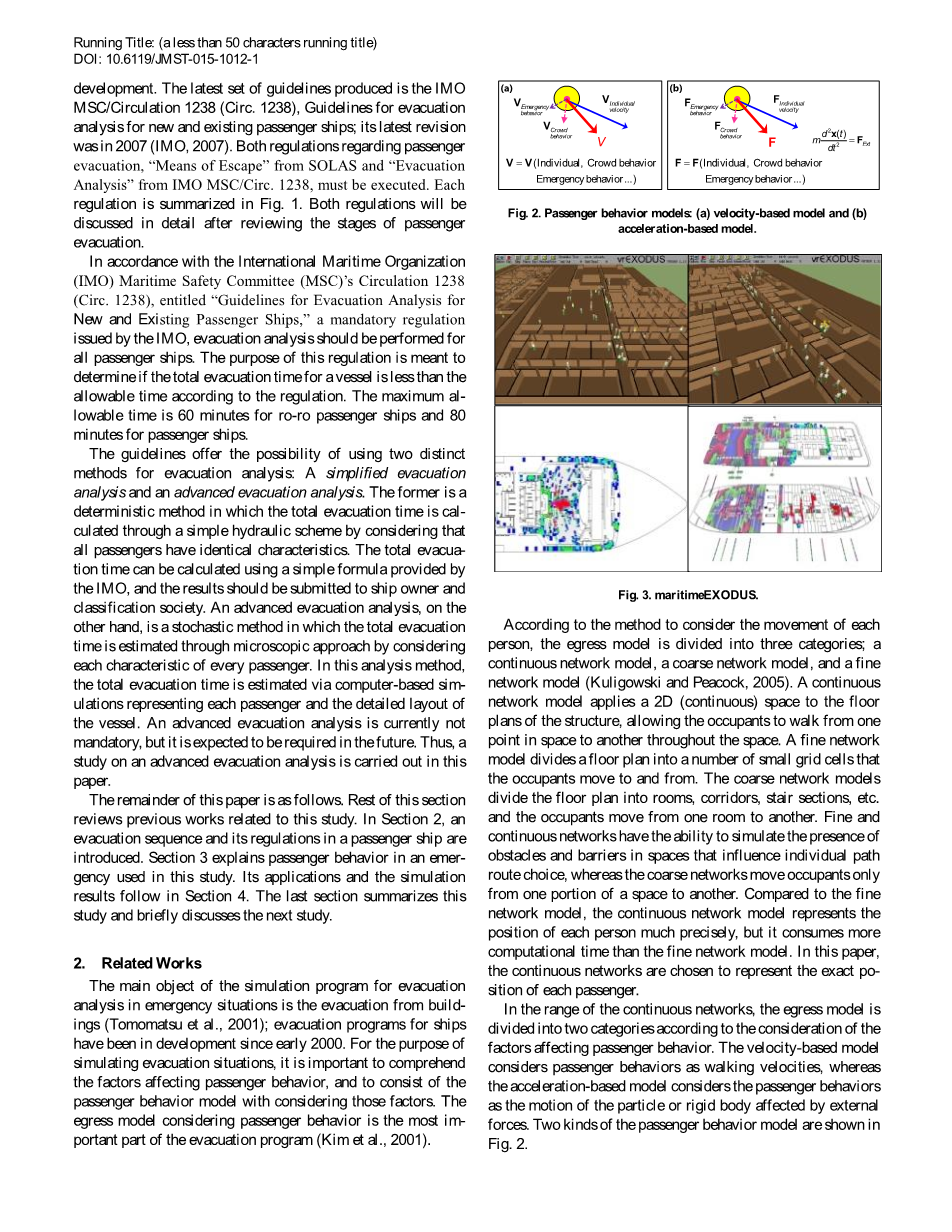 “爱沙尼亚”号客轮于1994年9月28日在波罗的海沉没,造成852人死亡。滚装客船是设计用来运载轮式货物的船舶,如汽车、卡车、半拖车和拖车,这些货物由它们自己的轮子或使用平台车辆(如自行式模块化运输车)在船上和船下行驶。爱沙尼亚悲剧发生后,国际海事组织(IMO)的海事安全委员会(MSC)于1995年颁布了一项规定,要求客滚船在设计阶段早期进行分析,以确定和解决逃生路线和救生中的潜在临界点设计的电器。1999年1月,海事组织海安会制定了疏散分析指南。但是,认识到关于这个问题的经验和数据非常有限,MSC认为这些准则是可以改进和进一步改进的“临时”准则。最新的一套指南是IMO MSC/Circulation 1238(Circ.1238),新客船和现有客船疏散分析指南;其最新修订版是2007年(海事组织,2007年)。《海上人命安全公约》关于乘客疏散的“疏散方式”和国际海事组织海安会/中国保监会关于“疏散分析”的规定。1238,必须执行。图1总结了每一项规定。这两项规定将在审查乘客疏散阶段后详细讨论。