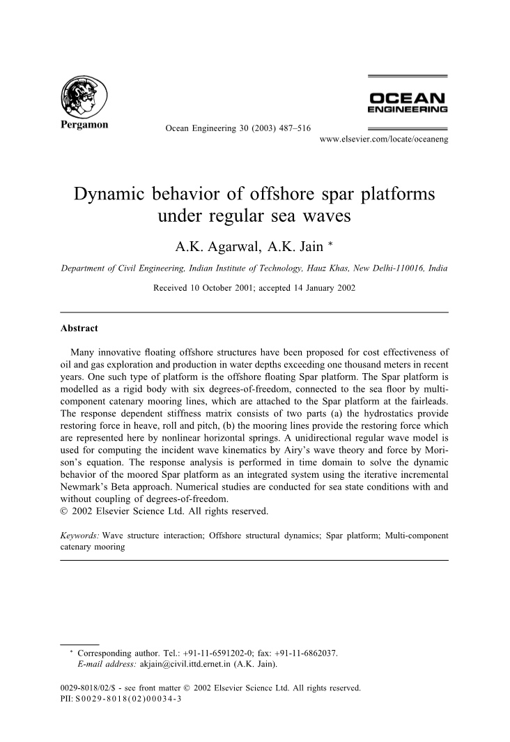 近几年来,许多具有创新性的深度超过一千米的海上漂浮物已被提出,用于石油和天然气勘探和生产。这样一个类型的平台是海上浮式Spar平台。Spar平台建模为的六自由度刚体,通过多元悬链线系泊线连接到海底,附着在Spar平台的导缆器上。响应相关的刚度矩阵分为两部分(a)流体静力学提供垂荡、纵摇和横摇的恢复力;(b)系泊线提供的恢复力,这是代表这里是非线性水平弹簧。Airy波理论和力的Morison方程用于计算一个单向的规则波模型入射波的运动学。响应分析是在时域中采用迭代增量Newmarkbeta;法集成系统进行来解决停泊的Spar平台的动态行为。数值模拟研究是有和无的程度下自由度耦合海况情况下进行。