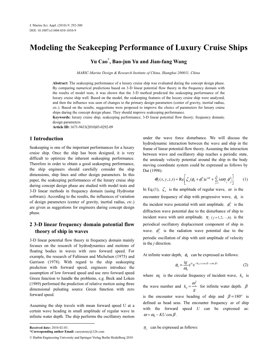关键词:豪华游轮;耐波性;三维线性势流理论;频域;设计参数