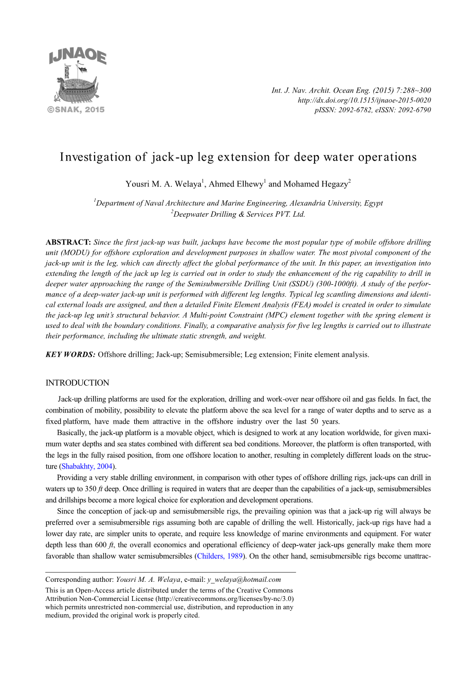关键词:近海钻探;自升式;半潜式;桩腿加长;有限元分析。