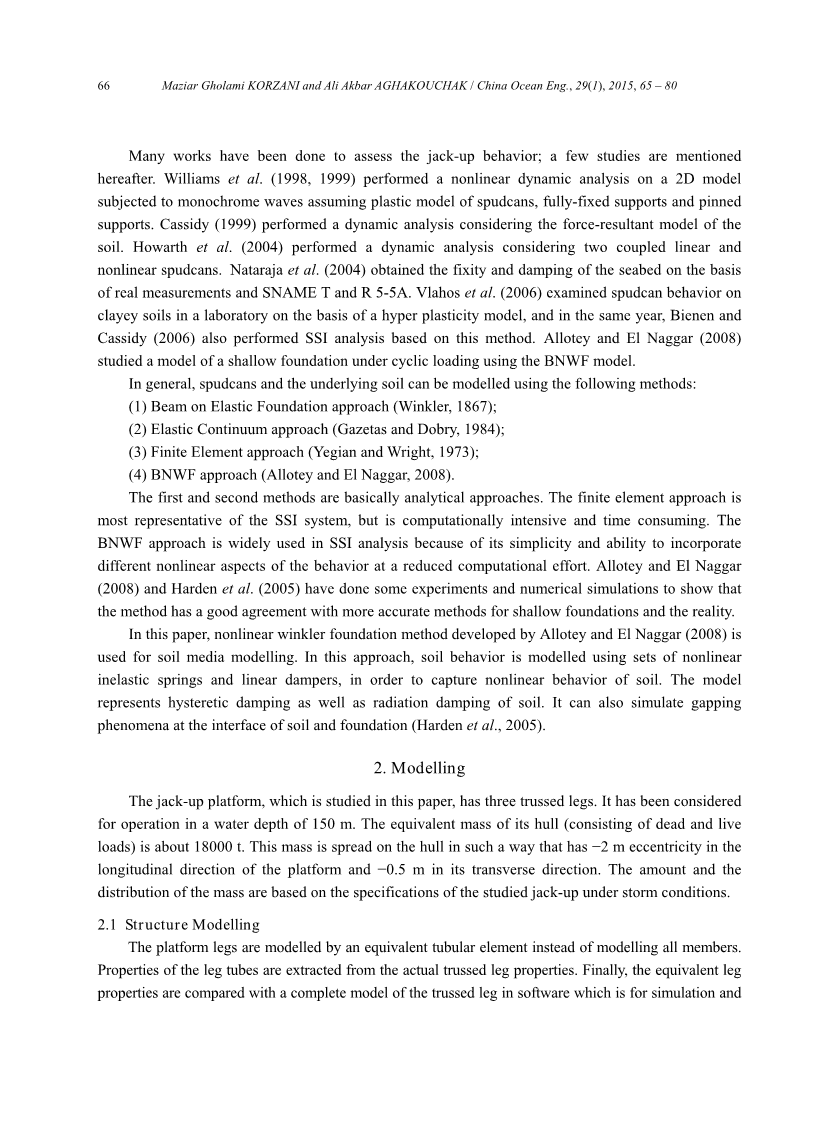 目前已经做了许多工作来进行评估自升式行为,例如下列所提到的研究。威廉斯等人(1998,1999)对经过单色波的2D模型进行非线性动力学分析,假设塑料模型为桩腿,全固定支撑和固定支撑。考虑到土体的力结果模型,Cassidy(1999)进行了动态分析。 Howarth等人(2004)进行了动态分析,考虑了两个耦合的线性和非线性桩腿。 Nataraja等人(2004)根据实测和SNAME T和 5-5A获得了海床的固定和阻尼。 Vlahos等人(2006)基于超塑性模型,在实验室中对粘土土壤的渗透性行为进行了研究,同年,Bienen和Cassidy(2006)也基于该方法进行了SSI分析。 Allotey和El Naggar(2008)利用BNWF模型研究了循环荷载下的浅基础模型。