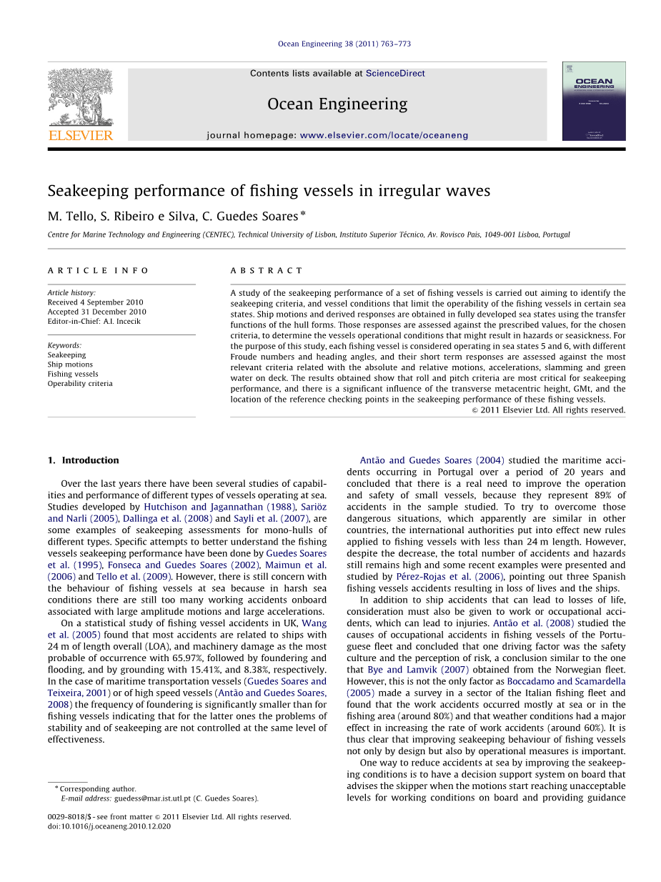 在过去的几年里,人们已经对不同类型船舶在海上作业的性能以及装载进行了一些研究。由Hutchison和Jaganantan(1988),Sariozuml;Narli(2005),Dallinga等人(2008)和Sayli等人(2007)开发的研究是单体船体耐波性评估的一些不同类型例子。Guedes Soares(1995),Fonseca和Guedes Soares(2002),Maimun等人(2006)和Tello等人(2009)对渔船的耐波性能有了更好的研究。然而,人们仍然担心在恶劣的海洋环境中,渔船在海上的表现。因为在恶劣的海况下,仍有太多的由大振幅运动和大加速度有关的工作事故发生。