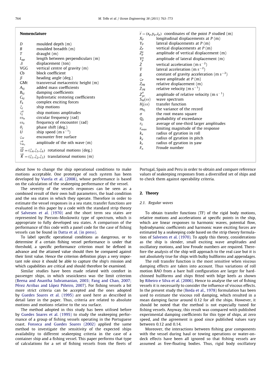 本研究所采用的方法以前曾被使用过。Guedes Soares等人(1995)研究耐波性能在葡萄牙的海岸研究一批渔船的耐波性能。Fonseca和Guedes Soares(2002)采用了相同的方法来研究船舶敏感性,研究方法适用于不同的海运标准集装箱船和捕鱼船。这篇论文就是用此计算方法计算了一系列葡萄牙、西班牙和秘鲁的渔船。通过相关参数比较不同船型的耐波性响应,将他们与相关的操作性指标进行比对。