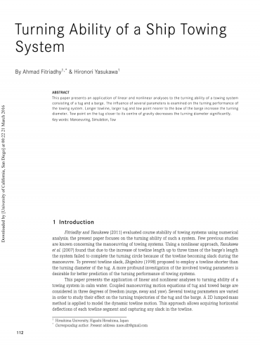 本文介绍了由拖船和驳船组成的拖带系统转向能力在线性和非线性分析中的应用,并研究了几个对拖带系统转向性能有影响的参数。更长的拖链,更大的拖船和更靠近驳船船首的牵引点增加了转弯直径,而靠近其重心的拖船上的牵引点明显地减小了转弯直径。