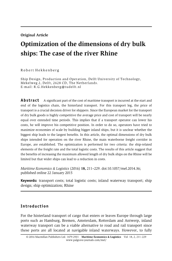 海运成本的一个重要部分是在物流链的开始和结束时发生的,腹地运输。对于这条运输线来说,运输价格是托运人的关键决定因素。由于欧洲干散货运输市场竞争激烈,平均价格和运输成本将在延长的时间段内几乎相等。这意味着,如果运输经营者可以降低他的成本,将会提高他的竞争地位。为了做到这一点,运营商曾试图通过建造更大的内河船舶来使经济规模最大化,但目前还不清楚最大的船只是否能获得最大的利益。本文对干散货的最佳尺寸进行了研究,在欧洲主要的水上货运通道莱茵河上建立了船舶,并对两个标准进行优化:运费相关的要素和总物流成本。这篇文章的结果表明,增加莱茵河干散货船最大允许长度的好处将是有限的,但更宽大的船舶可以导致成本的降低。