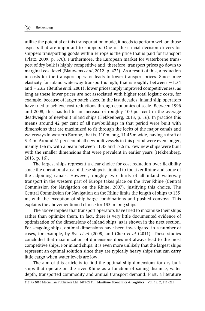 对于进出汉堡、不莱梅、阿姆斯特丹、鹿特丹和安特卫普等大型港口的内陆腹地货物运输来说,内河运输可能是道路和铁路运输的可行选择,因为这些港口都位于通航的内河航道。然而,要充分利用这种运输模式的潜力,它需要在那些对托运人很重要的方面表现良好。对于在欧洲运输货物的托运人来说,关键的决定因素之一是运输的价格(Platz,2009,第370页)。此外,欧洲市场的干散货的水上运输是高度竞争的,因此,运输价格下降到边际成本水平(Blauwens et al,2012,第472页)。出于这个原因,运输经营者的成本降低会导致运输价格降低。内河运输的价格弹性很高,大致介于1.34和2.62之间(Beuthe et al,2001),更低的价格意味着提高竞争力,只要这些较低的价格与较高的总物流成本不相关,例如在较大的批次尺寸的情况下。近几十年来,内河船舶经营人试图通过规模经济实现成本降低。在1996到2008年间,这导致了新建内河船舶的平均自重增加了大约100%(Hekkenberg,2013,第16页)。在实践中,这意味着大约42%的新船在那个时期建造的尺寸最大化以适应西欧主要运河和水道的尺度限定,即110米的长,11.45米的宽,有3到4m的吃水。在这段时间内,大概21%新船甚至更长,主要是135米,宽度在11.45米和17.5米之间的。在早期流行很少有新的船舶建造与较小的尺寸(Hekkenberg,2013,第16页)。