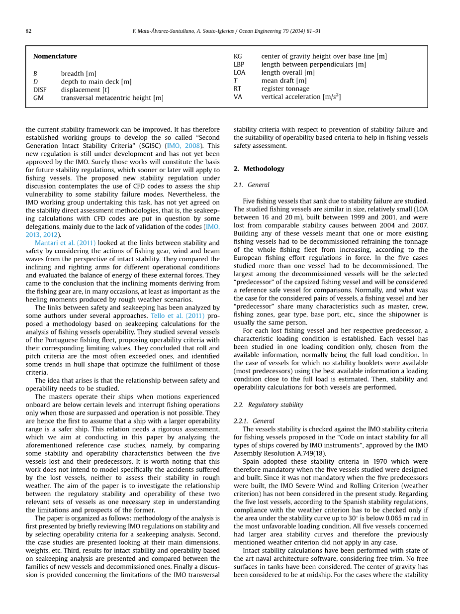 安全性和耐波性之间的联系已经由一些作者在几种方法下进行了分析。Tello等人提出了一种基于耐波性计算的渔船可操作性分析方法。他们研究了葡萄牙捕鱼船队的几艘船,提出了可操作性标准及其相应的极限值。他们得出结论认为横摇和纵摇情况是最容易超过限制规范的,并确定了船体形状的一些趋势,以优化这些标准的完成。