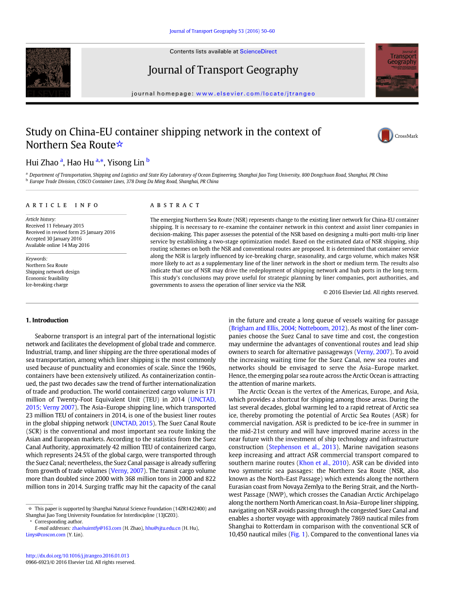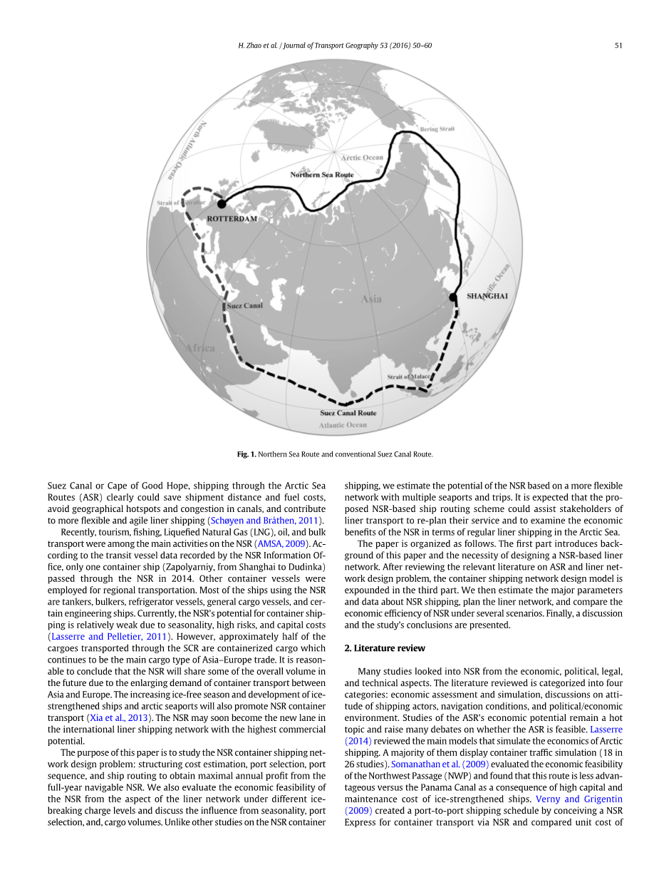 海运运输是国际物流网络的一个组成部分,有利于全球贸易和商业的发展。工业,流浪汉和班轮运输是海运的三种运营模式,其中班轮运输是最常用的,因为守时和规模经济。自20世纪60年代以来,集装箱已被广泛使用。随着集装箱化的继续,过去二十年来贸易和生产进一步国际化的趋势。2014年世界集装箱货运量为1.21亿二十英尺等效单位(TEU)(贸发会议,2015年;Verny2007)。亚欧航运公司于2014年运输了2,300万TEU集装箱,是全球航运网络中最繁忙的班轮航线之一(贸发会议,2015年)。苏伊士运河航线(SCR)是连接亚洲和欧洲市场的传统和最重要的航线。根据苏伊士运河管理局的统计数据,约有4200万TEU的集装箱货物,占全球货物的24.5%,通过苏伊士运河运输;不过,苏伊士运河通道已经受到贸易量增长的影响(Verny,2007)。自2000年以来,中转货量增加了一倍多,2000年为3.68亿吨,2014年为8.22亿吨。汹涌的交通可能冲击运河的通行能力在未来创造一个等待通过的船队的长队(布里格姆和埃利斯,2004年;Notteboom,2012)。由于大多数班轮公司选择苏伊士运河以节省时间和成本,拥挤可能会破坏传统航线的优势,并会导致船东寻找其他通道(Verny,2007)。为了避免苏伊士运河等待时间的增加,应该设想新的航线和网络为亚欧市场服务。因此,跨越北冰洋的新兴极地海洋航线正在吸引海洋市场的关注。