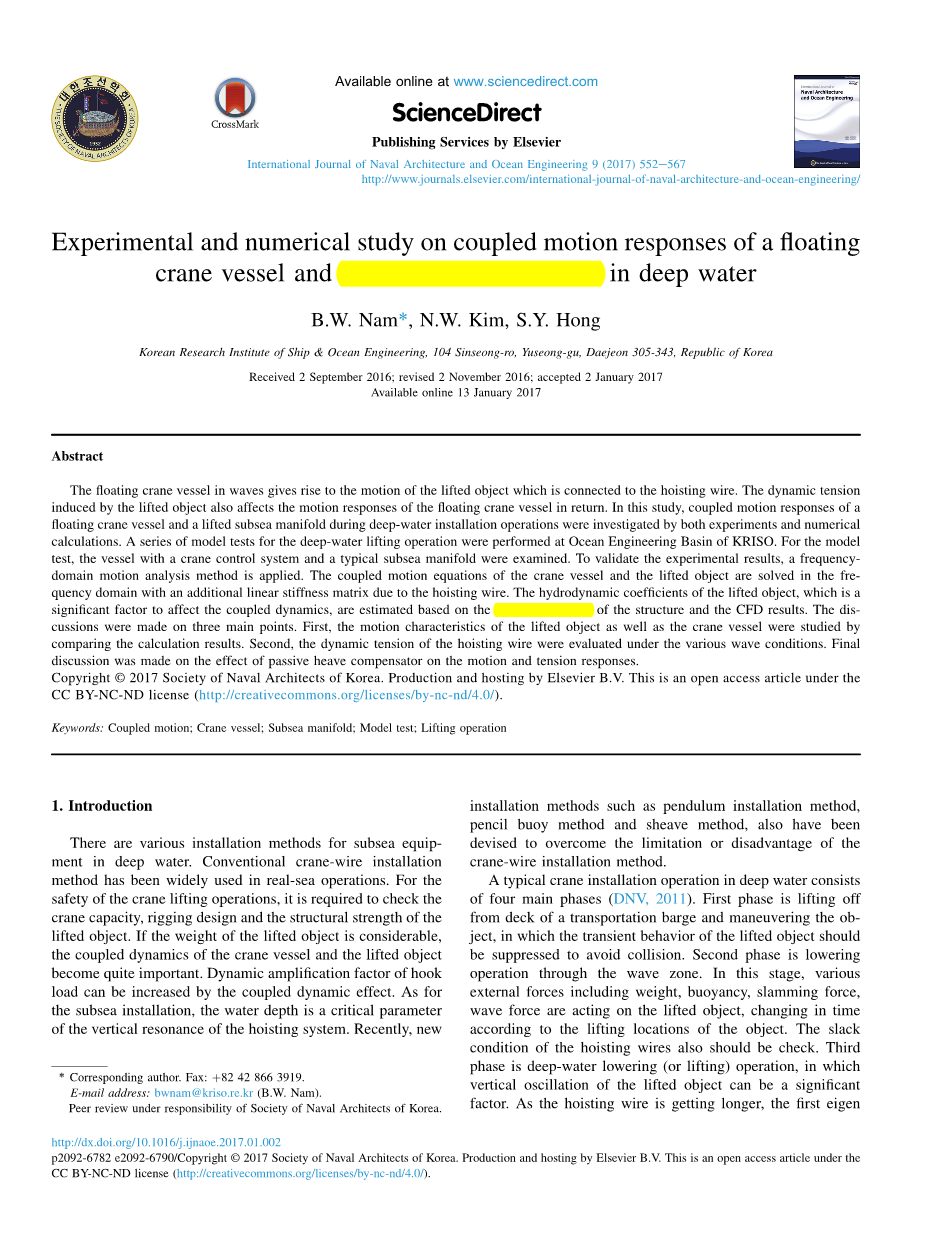 摘要:波浪中的浮式起重船会引起通过钢索连接的提升物体的运动。提升物体所引起的动态张力也会影响浮式起重船的运动响应。通过实验和数值计算,本文研究了浮式起重船和提升式水下起吊物在深水安装作业中的耦合运动响应。在韩国船舶与海洋工程研究所海洋工程水池,我们对深水起重作业进行了一系列模型试验。在模型试验中,我们对具有起重机控制系统的船舶和典型的水下起吊物进行了检验。为了验证实验结果,我们应用了频域运动分析方法。在频域内,通过提升钢索所产生的一个附加的线性刚度矩阵,我们解决了起重机和起重物体的耦合运动方程。根据结构的开孔率和CFD的结果,估计了起重物体的水动力系数,这是影响耦合动力学的重要因素。我们对三个主要问题进行了讨论。首先,通过比较计算结果,研究了起重物体和起重船的运动特性。其次,在各种波浪条件下,对提升钢丝绳的动态张力进行了评估。最后,讨论了被动升沉补偿器对运动和张力响应的影响。