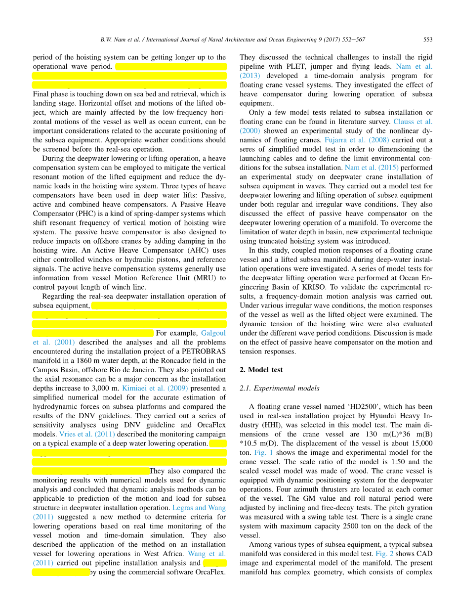 在文献调查中,只有少数几种与海底安装或浮式起重机有关的模型试验。Clauss等人(2000)对浮式起重机的非线性动力学进行了实验研究。Fujarra等人(2008)进行了一系列简化模型试验,以便对发射电缆进行尺寸测量,并确定海底安装极限环境条件。Nam等人 (2015)进行了深海起重机安装海浪设备的实验研究。在常规和不规则波浪条件下,他们对水下设备的深水降升作业进行了模型试验。他们还讨论了被动升沉补偿器对起吊物深水下沉作业的影响。为了克服流域水深的限制,介绍了采用截断式提升系统的新实验技术。