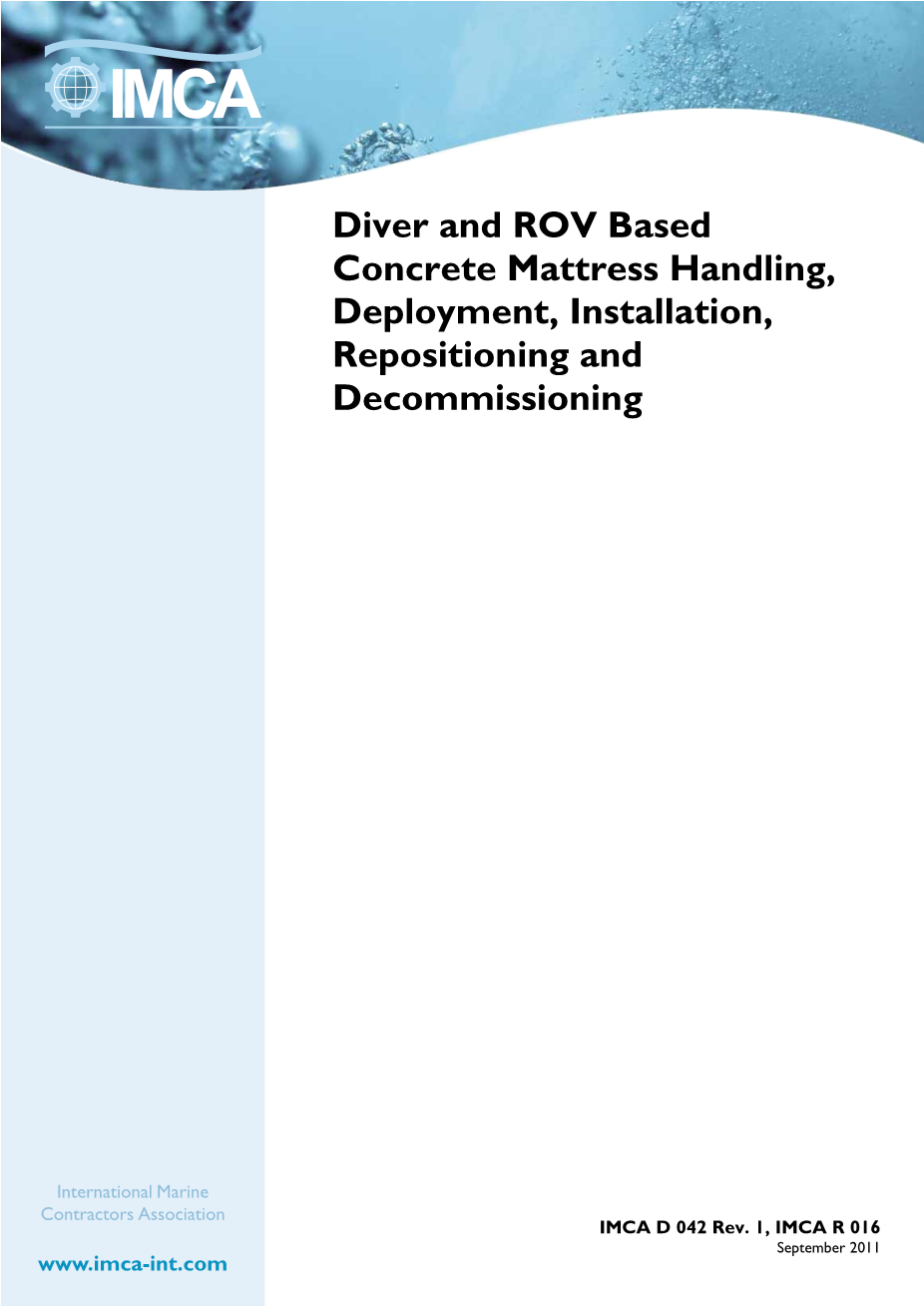 This guidance document was originally prepared for IMCA,under the direction of its Diving Division Management Committee. This revision has been updated by the Remote Systems amp; ROV Division Management Committee to include reference to the use of ROVs in mattress handling.