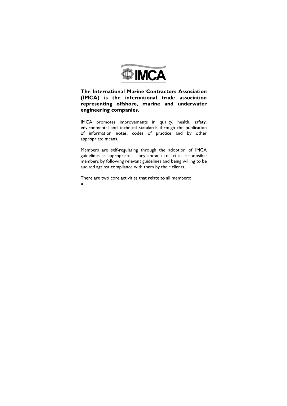 IMCA通过发布信息说明、实用规程和其他适当的方式,促进行业在质量、健康、安全、环保和技术标准的改善。