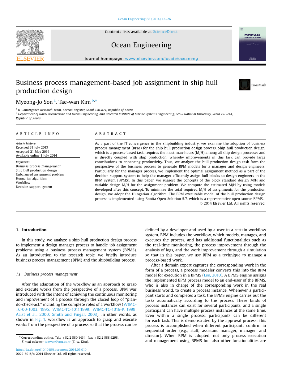 摘 要:作为造船行业IT融合的一部分,我们研究了船体生产设计过程中业务流程管理(BPM)的采用。 船体生产设计是一项基于过程的任务,所有船舶设计过程中所需的工时数(M / H)最多,并直接与船舶生产相结合,从而改进此任务可为提高生产力做出巨大贡献。 因此,我们从业务流程的角度分析船体生产设计任务,为经理和设计工程师生成BPM模型。 特别是对于经理流程,我们实施最优分配方法作为决策支持系统的一部分,以帮助经理有效地将船体模块分配给BPM系统(BPMS)中的设计工程师。 在本文中,我们提出了分配问题的块标准设计M / H和变量设计M / H的概念。 我们通过使用这个概念后开发的模型来计算估计的M / H。 为了最大限度地减少生产设计中任务总的M / H,我们采用匈牙利算法。 船体生产设计过程的BPM可执行模型是使用Bonita Open-Solution 5.7实现的,后者是一个具有代表性的开源BPMS。