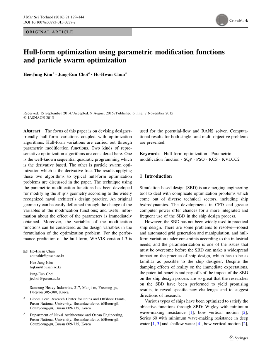 摘要:本文的重点是设计与优化算法相结合的设计优良型船体形式的变化。通过参数化修改函数进行船体形状变化。本文讨论了两种具有代表性的优化算法。一种是著名的序列二次规划,它是基于导数的。另一种是粒子群优化,它是自由的导数。本文对典型的船体结构优化问题进行了讨论。采用参数化修改函数的方法,根据著名的造船设计师的设计实践,对船舶的几何形状进行了修改。通过修改函数的变量,可以很容易地使原来的几何图形变形,还能得到有关参数效应的有用信息。此外,修改函数的变量可以作为优化问题的设计变量,对于船体形式的性能预测,WAVES1.3版本用于电位流和RANS求解器。给出了单和多目标问题的计算结果。