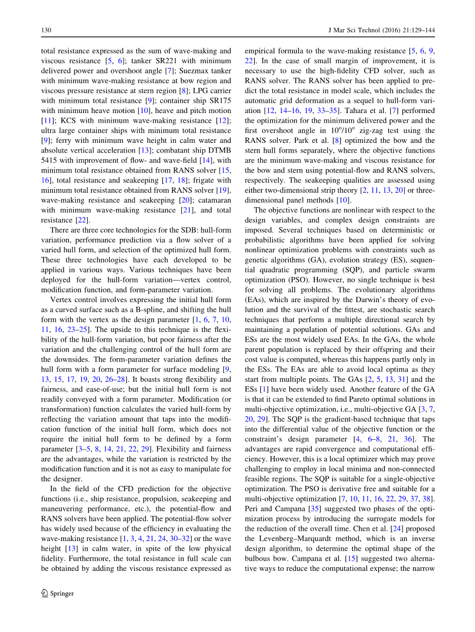 在设计变量上,目标函数是非线性的,还有复杂的设计约束。在遗传算法(GA)、进化策略(EAS)、序列二次规划(SQP)、粒子群优化(PSO)等约束条件下,应用基于确定性或概率算法的几种方法求解非线性优化问题。然而,没有一种技术是解决所有问题的最佳方法。进化算法(EAs)是由达尔文的进化论和适者生存理论所启发的,它是一种随机搜索技术,它通过维持一个潜在的解决方案来执行多种定向搜索。气体和ESs是最广泛使用的EAs。在气体中,整个母体被后代所取代,其成本价值被计算出来,而这种情况只发生在ESs中。EAs能够避免本地的optima,因为它们从多个点开始。煤气和ESs已经被广泛使用。GA的另一个特点是可以在多目标优化中扩展到找到帕累托最优解。多目标遗传算法(SQP)是基于梯度的技术,它利用了目标函数的微分值或约束的设计参数。其优点是收敛速度快,计算效率高。但是,这是一个本地优化器,它可能在局部最小和非连接可行域中被证明具有挑战性。SQP适用于单目标优化。PSO的导数是自由的,适用于多目标优化。Peri和Campana提出了优化过程的两个阶段,通过引入替代模型来减少总体时间。Chen提出了Levenberg-Marquardt方法,这是一种反设计算法,以确定球弓的最佳形状。Campana提出了两种减少计算费用的方法;采用遗传算法和基于遗传算法的变保真度方法。Tahara提出了针对多目标优化问题的统一覆盖(UNICO)方法。Campana提议,当目标函数需要高保真模型时,一个填充的基于功能的算法,它的第一个导数是不可用的。Kim将变保真优化模型应用于船体水动力优化问题:将现代装集箱船舶的波浪阻力最小化。