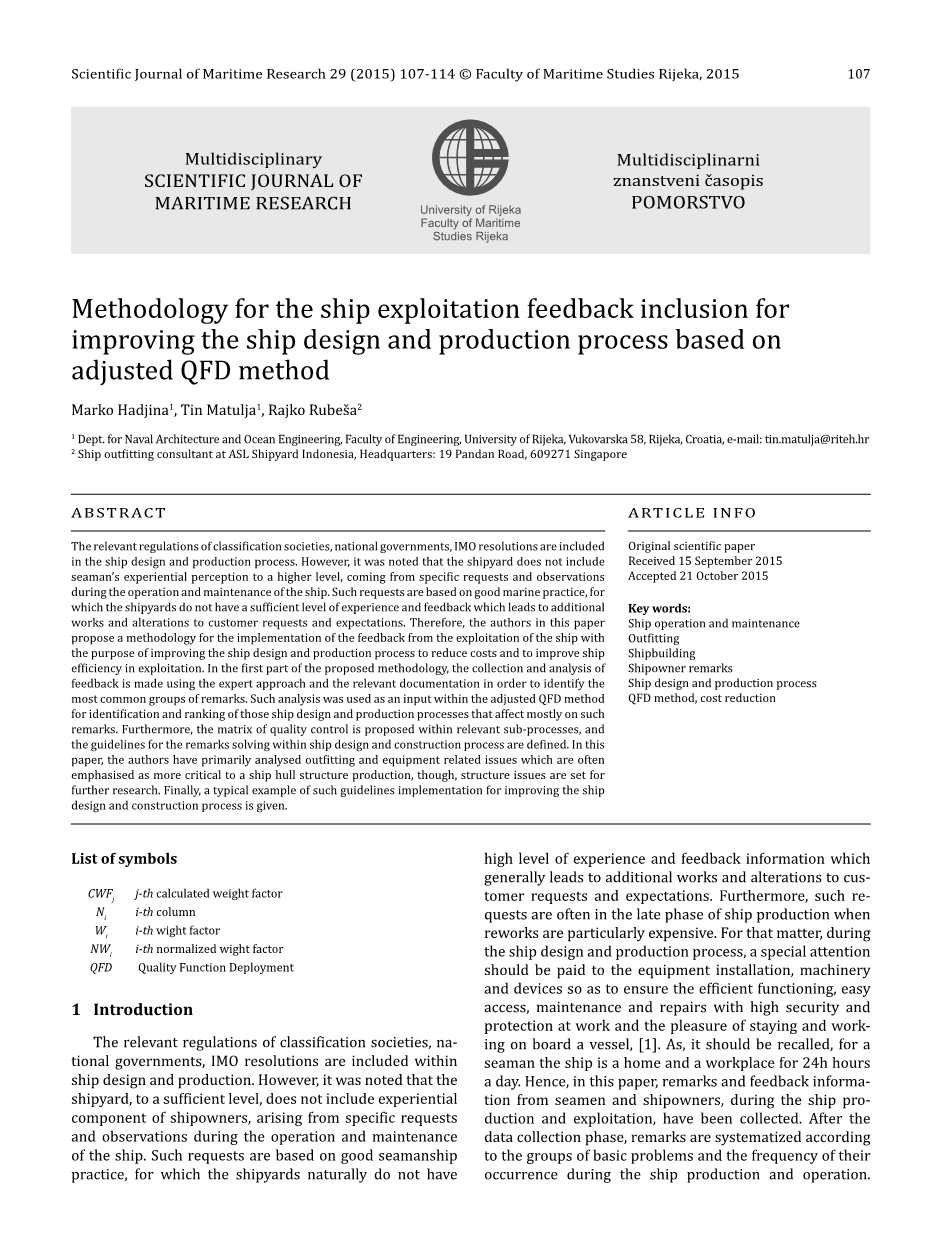 船级社、国家政府、海事组织决议的有关规定均列入船舶设计和生产。然而,据指出,船厂对船东的经验部分明显不了解,这是由于在船舶操作和维护期间的具体要求和观察所引起的。这种要求是基于良好的航海实践,对此船厂自然没有高水平的经验和反馈信息,这通常导致对消费者的要求和期望进行更多的工程和改造。此外,此类返工往往处于船舶生产后期,改造费用特别昂贵。为此,在船舶设计和生产过程中,应特别注意设备的安装、机械和装置,以确保高效运作、容易进入、维修和修理,工作时有高度的安全和保护,并享受在船上停留和工作的乐趣。应该记得,对于一个海员来说,这艘船每天24小时都是一个家和一个工作场所。因此,本文收集了海员和船东在船舶生产和开发过程中的意见和反馈信息。在数据收集阶段之后,根据船舶生产和运行中的基本问题组及其发生频率,对备注进行系统化。这些数据被用作在调整后的qfd方法中的输入,用于识别和排序那些对收集到的重新标记影响最大的船舶设计和生产子流程。在此基础上,提出了相关子过程中的质量控制矩阵,定义了求解船舶设计与施工过程的指导方针,旨在缩短船舶生产周期,降低成本,提高船舶质量。本文主要分析了船舶船体结构生产中经常被强调为更为关键的装备和设备相关问题,并提出了进一步研究的结构问题。最后,给出了改进船舶设计与施工过程的实施实例。