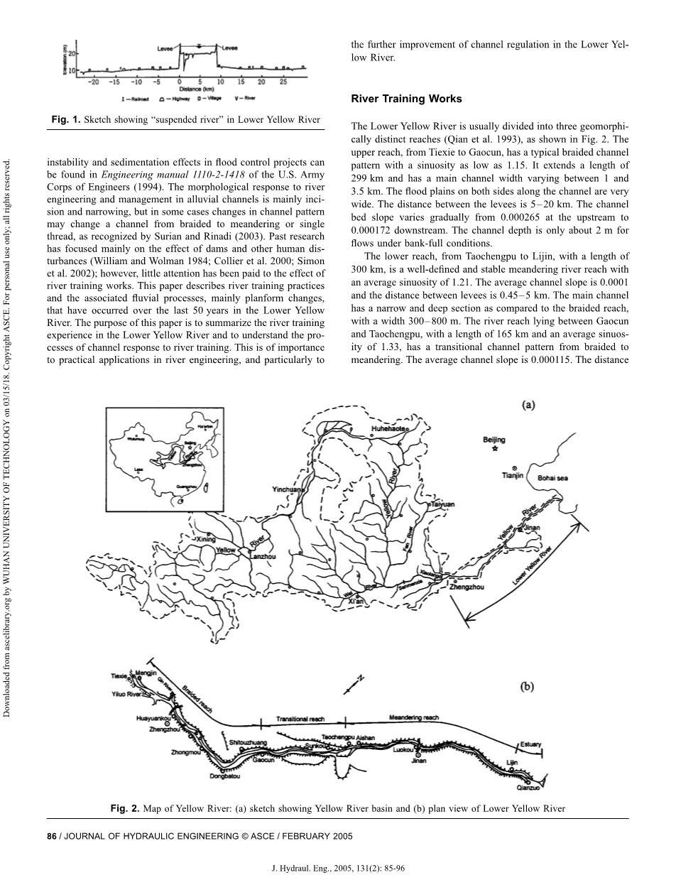 黄河下游河道整治是在实践经验的基础上发展起来的。它自然是从蜿蜒河段开始的,河道相对稳定。河道整治工程是在该河段修建的,通过保护局部凹岸侵蚀,稳定了一系列弯道。过去的经验表明,当导流双方共同作用到河道长度的80%时,河道一般是稳定的。在凹坑或弯道外使用工程的基本原理与教科书和工程手册中的指导原则基本相同。(1987;理查德森等人。1990;Knighton 1998;朱利安2002)。然而,在黄河下游,导流工程从蜿蜒河段延伸到过渡河段,最后延伸到辫状河段,在其他河流中并不常见。