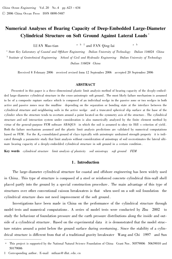 关键词:圆柱结构;塑性极限分析;土体各向异性;软土地基;有限元分析