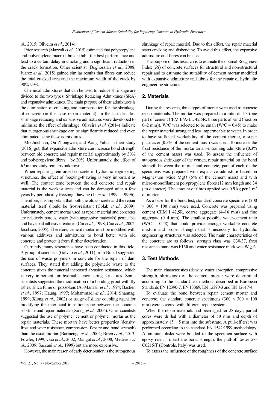 可用于减少收缩的化学外加剂可分为两种类型:减缩外加剂(SRA)和膨胀外加剂。这些外加剂的主要用途是消除裂缝和补偿混凝土收缩(在这种情况下修复材料)。在过去的几十年开发了收缩和膨胀的外加剂,以减少收缩的影响。 Oliveira et al. (2014)指出使用这些外加剂可以显著减少甚至消除自收缩。Mo Jinchuan, Ou Zhongwen, and Wang Yahui在他们的研究中指出(2016)膨胀剂可使旧混凝土和修补材料的粘结强度提高约30%,聚丙烯纤维能提高20%。不幸的是,RI在这项研究中的作用尚不清楚。在修补水工建筑物中的钢筋混凝土时,冻融的作用也是非常重要的。旧混凝土和修补材料之间的接触区是最脆弱的区域,通过几年的冻融循环就能破坏(Li et al., 1999a; 1999b)。因此,旧混凝土和修补材料本身都应具有抗冻性是很重要的(Colak et al., 2009)。不幸的是,用作修补材料的水泥砂浆和混凝土具有相对多孔性、水(具有侵蚀性的材料)可渗透性和粘接性差的特点 (Cai et al., 1998; Cao et al., 2002;Jacobsen, 2005)。因此,水泥砂浆必须用各种添加剂和外加剂进行改性,以更好地与旧混凝土粘结,并防止其进一步恶化。