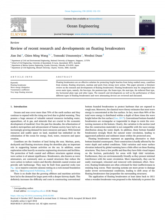 摘要:浮式防波堤是防止脆弱海滩被冲走、保护海岸线被侵蚀、保护浮式结构、防止码头和港口的强烈波浪作用。本文献介绍浮式防波堤的研究进展。浮式防波堤可分为七种主要类型,即箱式、浮筒式、框架式、席式、系绳浮式,横板式等。这些技术的研究和发展以及它们的性能综述和讨论了不同类型的浮式防波堤和消浪装置。
