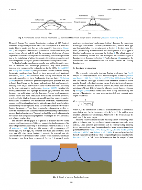 本文的目的是对不同类型浮式防波堤的研究与发展。我们应根据形状对其进行分类,有些类似麦卡特尼(1985)。它们是:(1)箱式(2)浮筒式(3)框架式(4)垫式(5)栓系浮式(6)水平板类型(7)其他类型。第2节介绍了研究和设计箱式防波堤的开发,以及一些实际已建造的防波堤。第3节是对浮筒式防波堤的评述。第4节讨论了框架式防波堤。第5、6、7节分别讨论了垫式、系绳浮式、水平板类型防波堤。其他类型的浮式防波堤见第8节。与不同类型的防波堤搭配的防浪装置的有效性在第9节中讨论。最后,第10节总结了对未来研究的结论和建议防波堤。