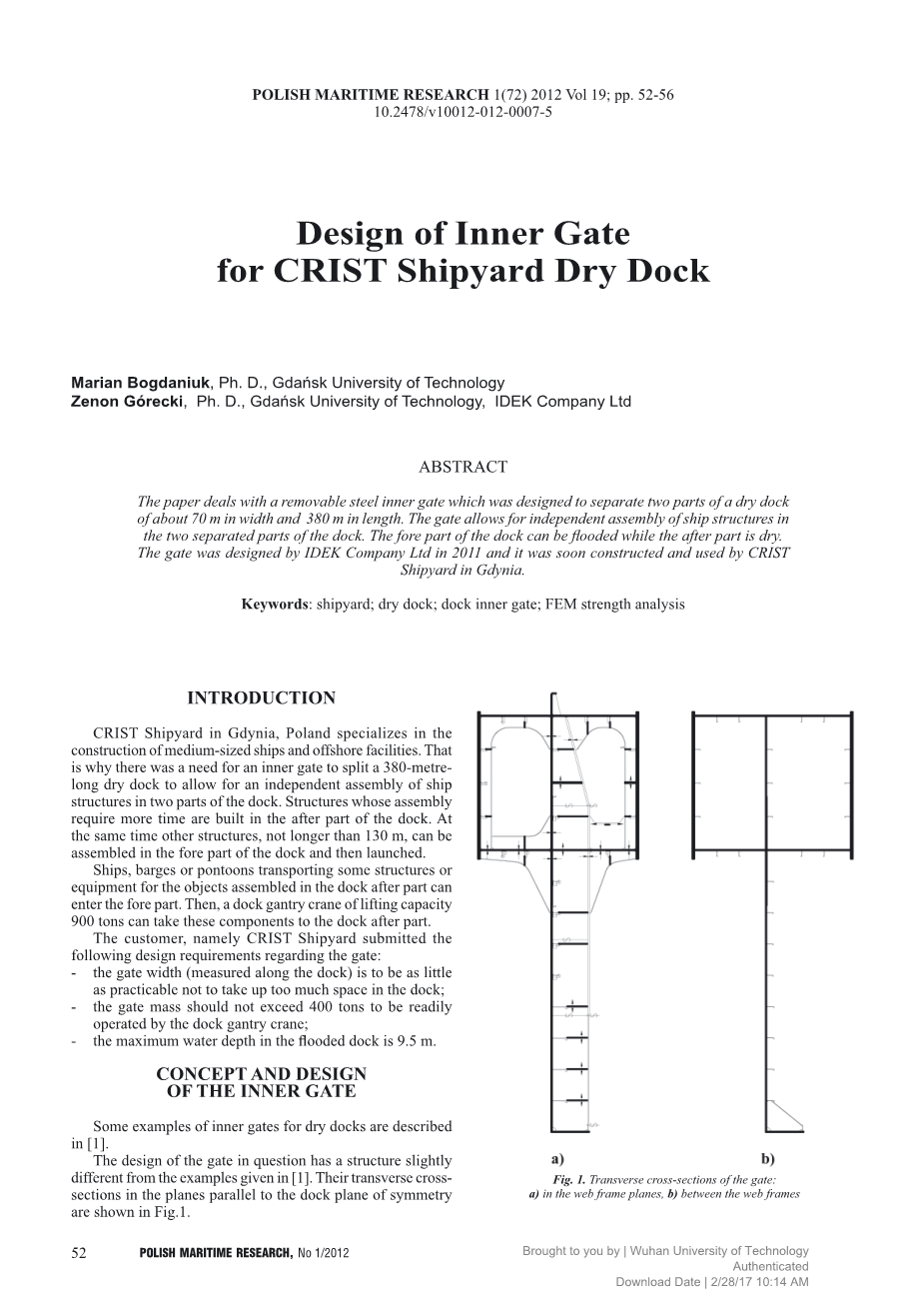 本篇文章涉及到一个可移动式的钢制内闸门,该闸门设计被用于将一个宽度约为70米和长度约为380米的干船坞分离为两个部分。这个闸门将允许在船坞的两个分开的部分中独立地组装一些船舶结构。可以使得船坞的前面部分被填满水的同时,保证船坞后面部分是干的。这个闸门是由IDEK有限公司在2011年所设计出来的,而且该闸门不久就被建造完毕并被位于格丁尼亚的克里斯特造船厂所使用。