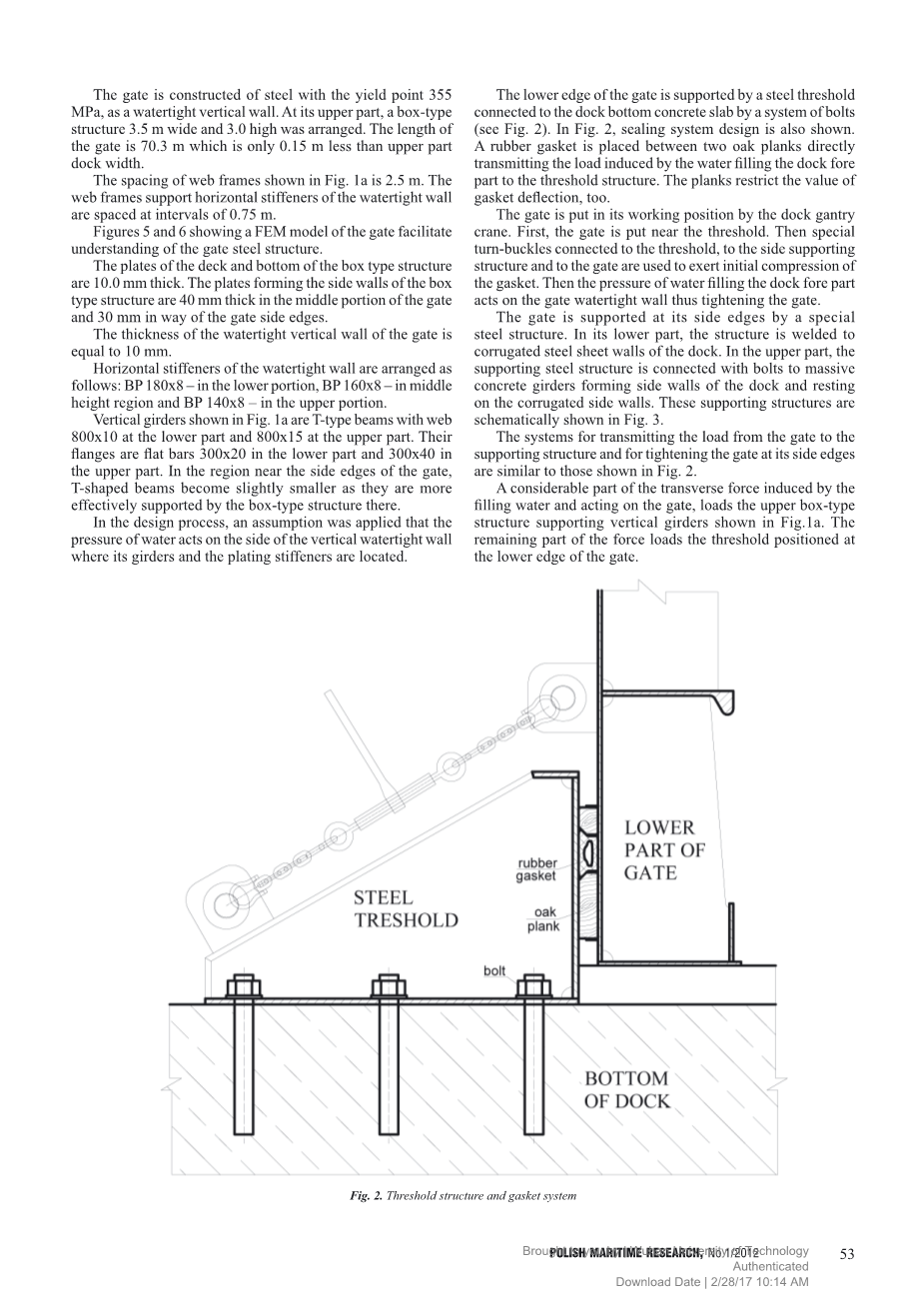 闸门的稍下边缘是由通过螺栓系统连接到船坞底部混凝土板的钢门槛所支撑的(如图2中所示)。密封系统的设计在图2中也有所示出。一个橡胶垫圈被放置在两个橡木板之间,直接传递由船坞前面部分的水填充到门槛结构所引起的载荷。这些板也限制了垫片的挠度值。