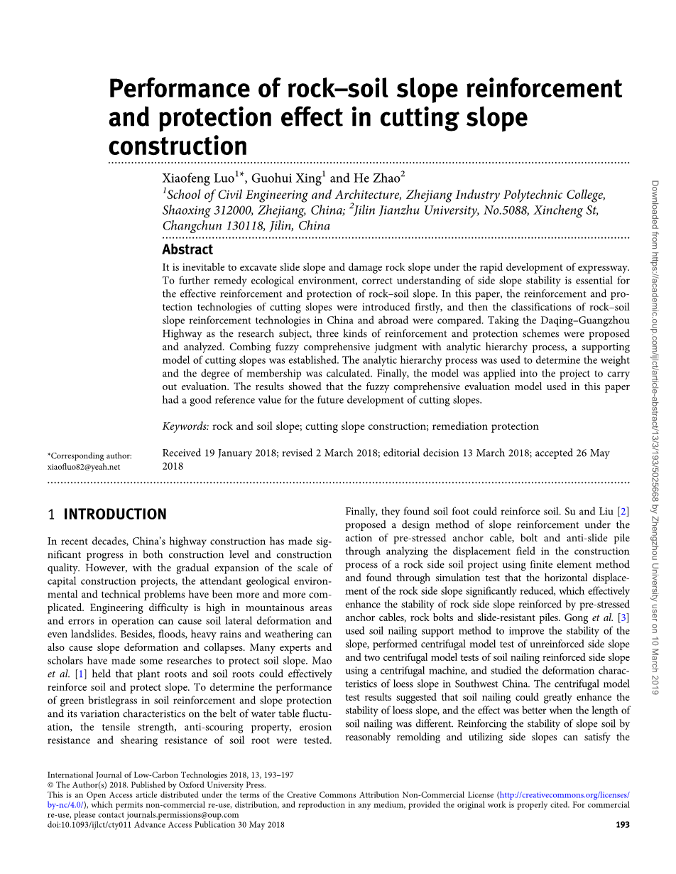 摘要:当今高速公路快速发展,不可避免的要进行开挖边坡和摧毁石坡等工程的操作,为了更好的弥补对生态环境的所造成的影响,正确理解滑坡稳定性对有效加固和护坡措施是十分有必要的。在本文中,对于削坡加固和保护技术会首先介绍,同时,会对于国内外的土坡加固技术的不同类型进行比较,提出并分析三种加固组合方式。结合模糊综合评估法和分析层次法的过程建立一个辅助性的削坡模型,层次分析法用于决定计算要素的权重程度,最终将这个模型用于工程中进行评估。结果显示,本文中的模糊综合评估模型对于之后的削坡工程发展有广泛的参考价值。