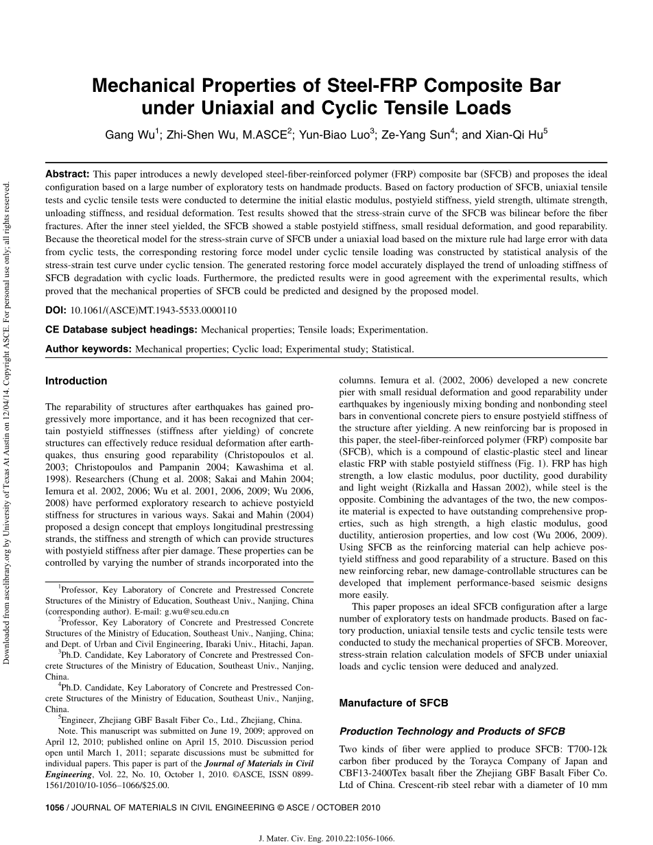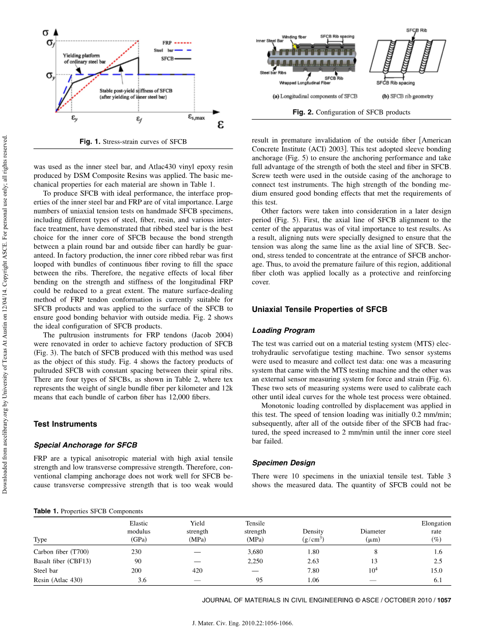地震后结构的修复变得越来越重要,并且钢筋混凝土结构的屈服后刚度(结构在屈服后的刚度)能够有效减少残余变形保证良好的修复性能这一点已经被广泛认知。研究人员已经进行了探索性研究,以各种方式来实现结构的屈服后刚度。sakai和Mahin提出了一个采用纵向预应力链的设计概念,其刚度和强度可以在桥墩损坏后为结构提供屈服后刚度。这些属性可以通过改变列中包含的链数来控制。在传统的混凝土桥墩上巧妙地将粘结和非粘结钢条结合在一起,以确保结构在屈服后的刚度,从而开发出一种新的混凝土桥墩,在地震作用下具有小的残余变形和良好的修复性能。本文提出了一种新的增强杆,即钢-纤维复合杆(SFCB),它是一种由弹塑性钢和线性弹性纤维复合而成,具有稳定的屈服后刚度。frp的强度高,弹性模量低,延展性差,耐久性好,重量轻(Rizkalla and Hassan 2002),而钢则相反。结合两者的优点,这种新型复合材料可望具有优异的综合性能,如强度高、弹性模量大、延展性好、抗蚀性能好、成本低(Wu 2006, 2009)。使用SFCB作为加固材料,可以帮助实现结构的复合刚度和良好的修复。在这种新型加固钢筋基础上,新的实施于因地震引起的破坏控制结构能被更容易地建立起来。本文在对手工制品进行了大量的探索性试验后,提出了一种理想的SFCB结构。在工厂产品的基础上,进行了单轴拉伸试验和循环拉伸试验,研究了SFCB的力学性能。并且,推导并分析了单轴载荷和循环张力作用下的应力-应变关系计算模型。