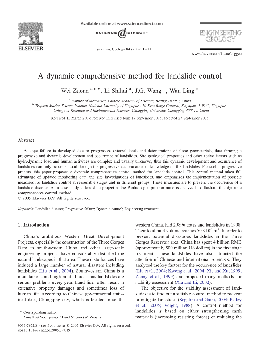 对滑坡稳定性评价的目的是找到一个合适的控制方法,防止或减轻滑坡。治理滑坡的方法是以加固土质材料(增加抗力)或减少滑坡潜在滑动质量为基础(减小驱动力)内的质量权重,或两者兼而有之。对于滑动质量,控制方法要求停止或扭转那些加剧其不稳定性的因素。目前的滑坡治理措施包括:地表排水和地下治理,滑动地区的水,挖掘和重新分配滑动质量,并安装保留设施。对于滑动块体,某些单一措施,特别是作为支护设施的加固桩措施进行了详细的研究。然而,潜在的或渐进的滑坡随着外部和内部荷载因素的演变而演变的。对于这类滑坡,必须立即采取一项或多项措施防止进一步滑坡的发展。这些措施不仅包括传统的“硬”补救措施,如保留设施,还包括一些“软”措施,如外部负荷管理和内部因素。到目前为止,除了传统的滑坡治理方法外,没有创新的方法可用于滑坡治理。传统的方法适用于那些已经处于临界状态并具有充分信息的滑坡。对于潜在的滑坡和渐进的滑坡,常规方法由于其技术缺陷和高成本而不适合。文中还列举了几种常用的滑坡治理方法的失效实例。事实上,滑坡在其状态演变、风险评估和减灾方面是一个复杂的机械问题。相比之下,福建省某大型滑坡采用不同的滑坡治理方法,成功地治理了近10年之久。在本报告中,我们分析了 总结了滑坡发育演化的特点,总结出一种新的滑坡治理方法——动态综合防治法。本文首先论述了动态综合控制方法与常规控制方法相比的地质背景、内容和优势。我们进一步分析了效率和 通过实例分析,验证了该方法的成本效益。