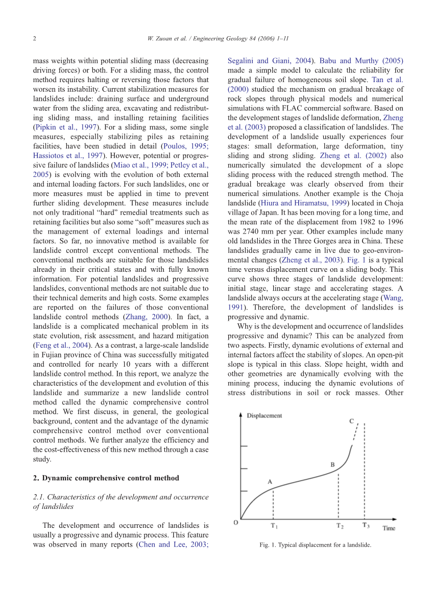 滑坡的发生和发展通常是一个渐进和动态的过程。在许多报告中都提到了这一特性并建立了均匀土质边坡渐进破坏可靠度计算的简单模型。谭等人利用FLAC商业软件,通过物理模型和数值模拟研究了岩石边坡的渐进破坏机理。基于滑坡变形的发展阶段,郑等人提出了滑坡分类。滑坡的发展通常经历四个阶段:变形小, 变形大,滑动小,滑动强烈。郑等人用折减强度法数值模拟了边坡滑动过程的发展过程。从数值模拟中可以清楚地观察到这种逐渐断裂现象。另一个例子是位于日本Choja村的Choja滑坡。它一直在移动 从1982年到1996年,平均流离失所率为2740毫米/年。其他例子包括中国三峡地区的许多老滑坡。这些滑坡由于地理环境和人类活动逐渐形成。图1是滑动体上的一种典型的时间-位移曲线。这条曲线显示了滑坡发展的三个阶段:初始阶段。 阶段、线性阶段和加速阶段。滑坡总是发生在加速阶段。因此,滑坡的发展是渐进的、动态的。