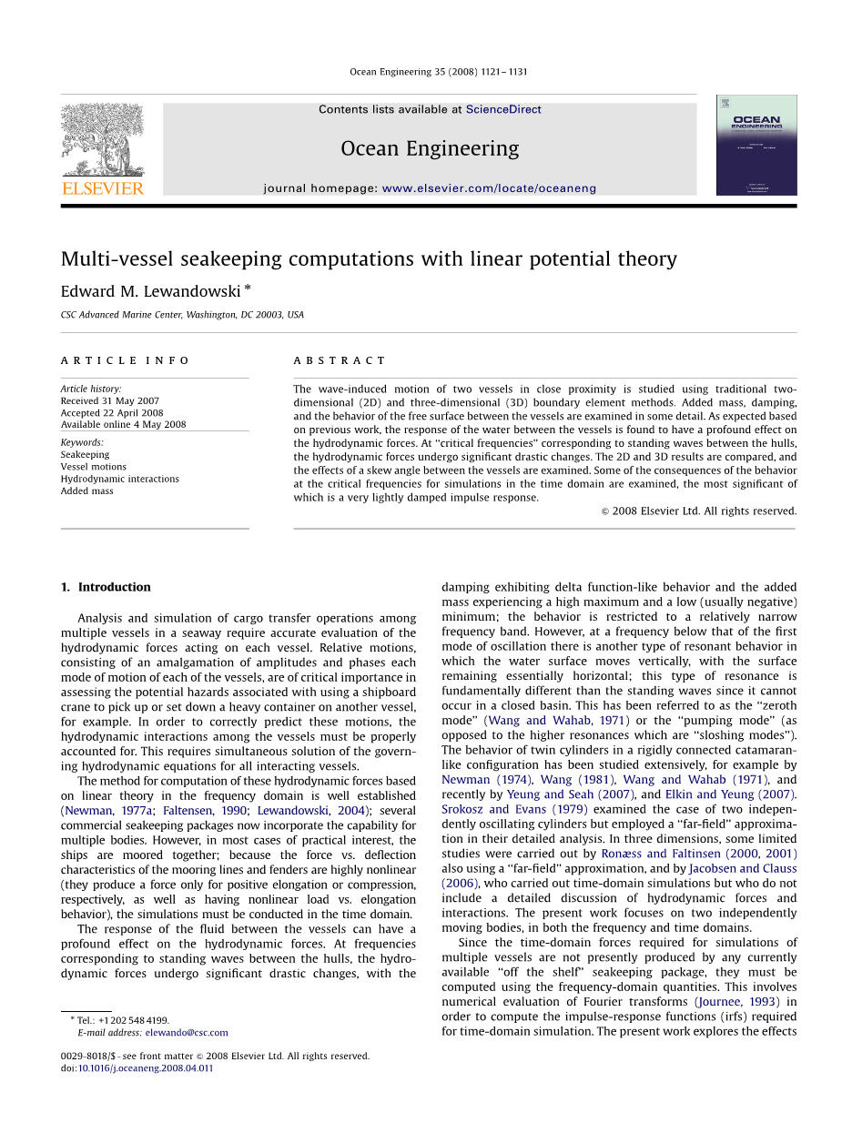船只之间流体的反应可以对流体动力产生重大的影响。在与船体之间的驻波相对应的频率上,水动力经历显著的剧烈变化,其中阻尼表现出delta;函数类行为并且附加质量经历最大值和最小值(通常是负值);该行为被限制在相对较窄的频带内。然而,在低于第一振动模式的频率下,存在另一种类型的共振行为在水面垂直移动时,其中表面保持基本水平;这种类型的共振与驻波有本质上的不同,因为它不能发生在封闭的水域中。这被称为“零模式”(Wang和Wahab,1971)或“泵模式”(相对于更高的共振即“晃动模式”)。例如Newman(1974),Wang(1981),Wang和Wahab(1971)以及最近由Yeung和Seah(2007)和Elkin和Yeung(2007)等人在严格连接的双体船状结构中的双缸圆柱体的行为已经被广泛地研究了。 Srokosz和Evans(1979)研究了两个独立振荡柱体的情况,但在他们的详细分析中采用了“远场”近似值。在三维方面,Ronaelig;ss和Faltinsen(2000,2001)进行了一些有限的研究,他们也使用了“远场”近似值,Jacobsen和Clauss(2006)进行了时域模拟,但没有详细讨论水动力和相互作用。目前的工作主要集中在频率和时间域上的两个独立运动的物体。