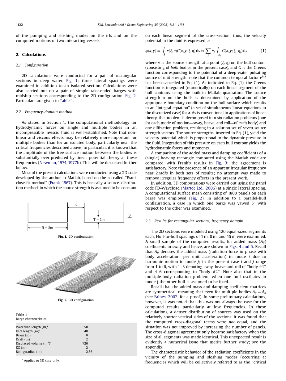 对深水中一对矩形截面进行了二维计算。1;除了一个孤立的截面外,还检查了三个横向间隔,并对一对简单的前缘驳船进行了计算,这些驳船的中段对应于2d结构,图2,详情载于表1。