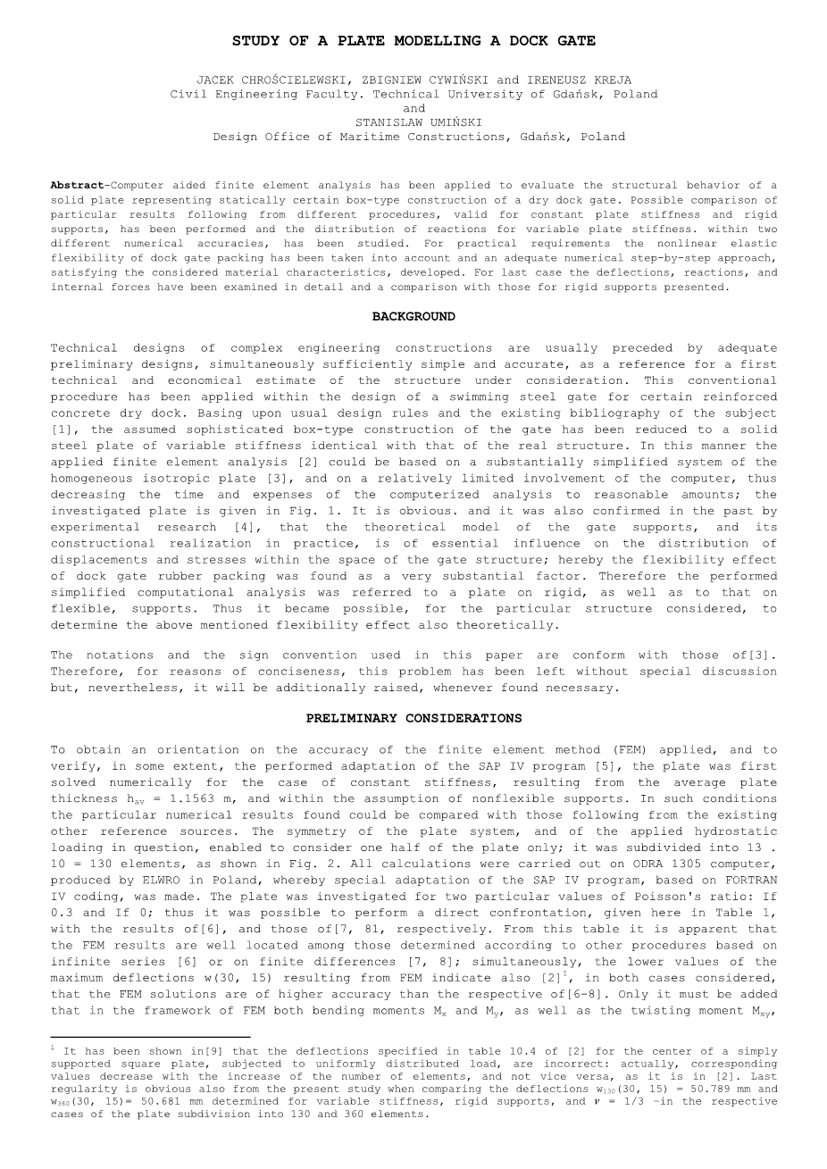 复杂工程建筑的技术设计通常在充分的初步设计之前,同时足够简单和准确,作为对所考虑结构的第一次技术和经济估算的参考。这种传统的程序已经应用在用于某钢筋混凝土干船坞的游泳钢闸门的设计中。根据通常的设计规则和现有关于这方面的参考文献[1],假定的复杂的箱式结构的门被缩减为与实际结构相同的可变刚度的实心钢板。通过这种方式,应用有限元分析[2]可以基于简单的均匀各向同性板[3]系统和计算机相对有限的参与,从而将计算机化分析的时间和费用减少到合理量; 所调查的板块如图1所示。很明显。并且过去也通过实验研究证实了门支撑的理论模型及其在实践中的结构实现对门结构空间内的位移和应力的分布具有重要影响; 因此发现码头门橡胶包装的柔性效应是非常重要的因素。 因此,所执行的简化计算分析被称为刚性板,以及柔性支撑板。因此,对于所考虑的特定结构,在理论上也可能确定上述柔性效应。