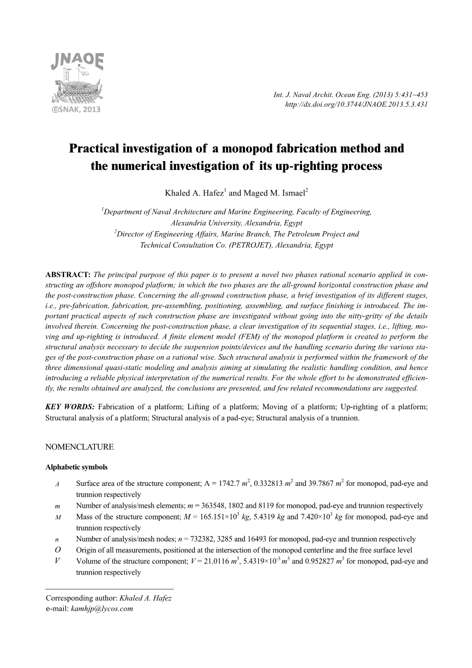 摘要:本文的主要目的是提出一种适用于构建离岸单脚架平台的新颖的两阶段合理方案;其中两个阶段是全地面水平施工阶段和施工后阶段。关于全地面施工阶段,介绍了对其不同阶段,即预制造,制造,预组装,定位,组装和表面处理的简要研究。对这种构建阶段的重要实践方面进行调查,而不涉及其中涉及的细节的细节。关于施工后阶段,介绍了对施工后阶段,即升降,升降和升降的明确调查。创建单脚架平台的有限元模型(FEM),用于在理性明智的情况下,在施工后阶段的各个阶段执行必要的结构分析,以确定悬挂点/设备和处理场景。这种结构分析是在三维准静态建模和分析的框架内进行的,目的是模拟真实的处理条件,从而引入数值结果的可靠物理解释。为了有效地证明整个努力,分析得到的结果,给出结论,并提出少量相关建议。