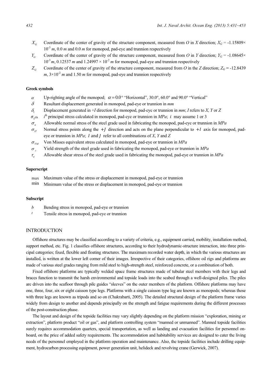 Al-Sharief(1995)简要描述了沙特阿美公司实践的海上平台的设计考虑以及其中使用的术语。突出了用于计算设计载荷,制造和装配程序的方法。简要解释了在加工场地的质量控制适用性。此外,还介绍了安装在阿拉伯湾的固定海上平台的装载,运输和安装程序。