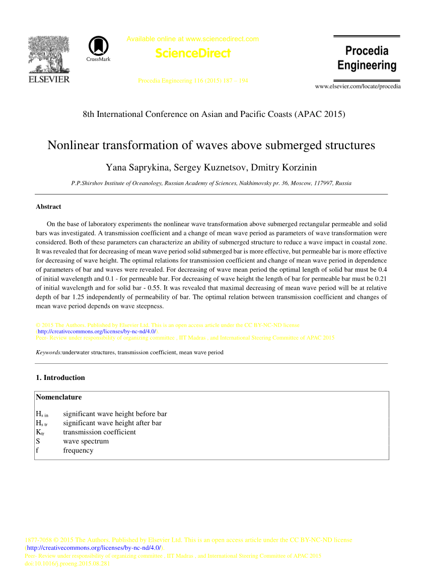 Kuznetsov S, Saprykina Ya., 2013. Combinations of submerged structures and floating breakwater for shore protection. Coas