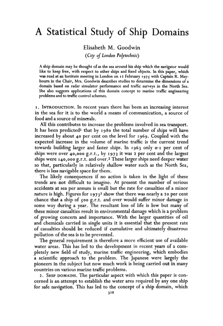 一个船舶领域可以被认为是船舶周围的海洋,驾驶员将其他船舶和固定对象保持在该海洋区域之外。在这篇论文中,古德温夫人描述了基于雷达模拟器性能和北海交通调查来确定领域大小的研究。她还建议将这一领域的概念应用于海洋交通工程问题和交通控制方案。