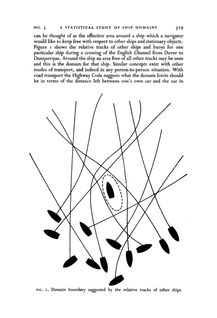 2.船舶领域。本文所关注的特殊方面是试图确定任何一艘船安全航行所需要的水域。这就产生了船舶领域的概念,它可以被认为是一个有效的区域,相对于其他船只和静止物体,一个航海家想要保持自由。图1显示了从多佛到敦刻尔克穿越英吉利海峡时,某艘特定船只的其他船只和浮标的相对轨迹。在船的周围可以看到一个没有其他痕迹的区域,这就是那艘船的领域。类似的概念也存在于其他交通方式,甚至在任何人与人之间的情况下。在公路运输方面,《公路法》建议,根据图1中自己的车与该车之间的距离,领域限制应该是多少。虽然任何驾驶员都知道,在实际操作中所采用的标准在很大程度上取决于某一特定驾驶员的性情和经验,但域边界是由其他前方船舶的相对航迹所建议的。在空中,相应的想法是分离标准,但在这里,实际上是对飞机的运动进行控制,以维持这些标准,这些标准的设置是为了将飞行错误引起的碰撞风险降到最低。