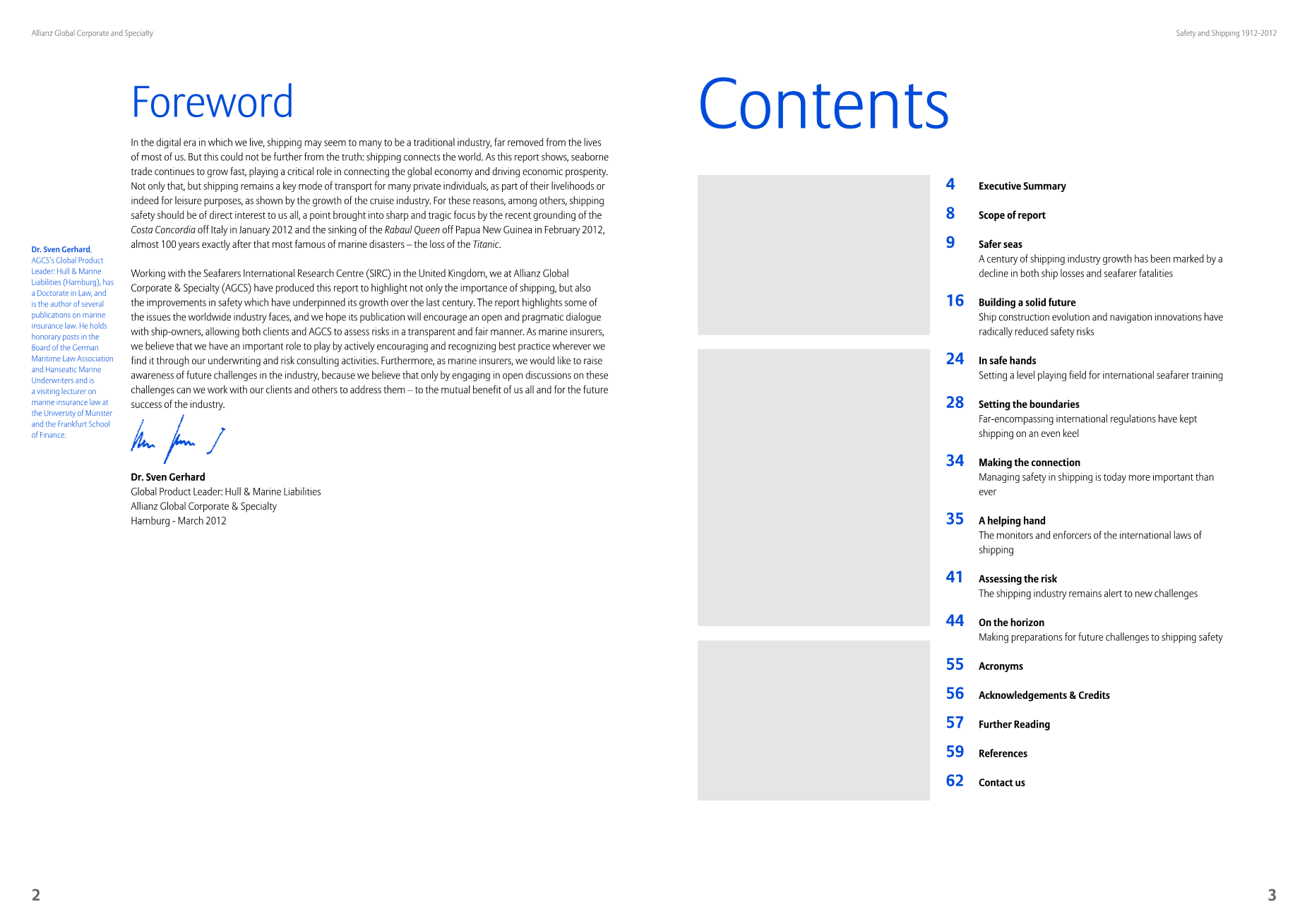 与联合王国的海员国际研究中心(SIRC)合作,我们在安联全球企业与专业公司(AGCS)编制了这份报告,不仅强调了航运的重要性,还强调了自上个世纪以来安全性的提高。该报告重点介绍了全球行业面临的一些问题,我们希望其出版将鼓励与船东进行开放和务实的对话,使客户和AGCS能够以透明和公平的方式评估风险。作为海运保险公司,我们相信,通过我们的承保和风险咨询活动,通过积极鼓励和认可最佳实践,无论在哪我们都可发挥重要作用。此外,作为海运保险公司,我们希望提高对行业未来挑战的认识,因为我们相信只有通过就这些挑战进行公开讨论,我们才能与我们的客户和其他人共同解决这些挑战 - 为了我们的共同利益所有和未来的行业成功。