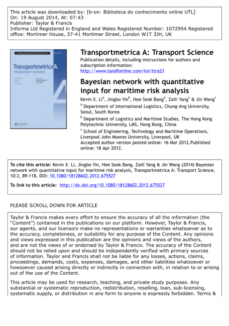摘要:本文提出了一种将Logistic回归和贝叶斯网络(BNs)集成到海上风险评估中的创新方法。这一方法已发展并应用于海事行业的个案研究,有可能也适用其他行业。BNs作为一种建模工具,在海事风险分析中的各个方面中得到了广泛的应用。然而,贝叶斯方法还是有缺陷的,它需要过多的先验概率形式的信息,并且在风险评估中往往很难获得这种信息,如果可以的话,在风险分析中,用专家估计(输入)作为不确定性的度量是估计事故先验概率的一种传统方法,也是一种常用的方法。为了解决与主观概率相关的遗传问题(专家估计),本研究开发了一种利用不同海事事故数据资源为BN提供输入的二元Logistic回归方法。通过测量不同类型船舶在不同情况下的安全水平,已取得了相关的风险评估结果。