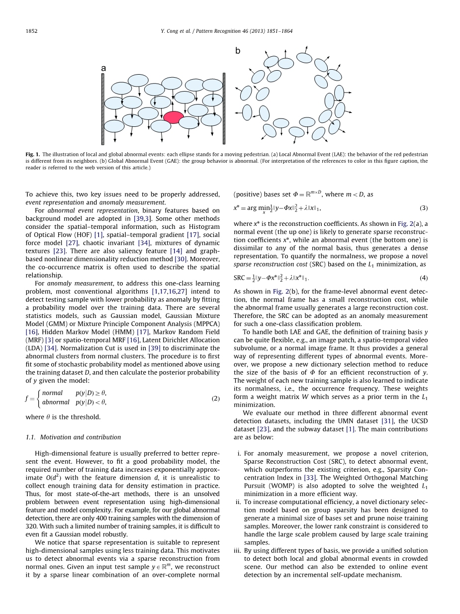 其中x*是重建系数。如图2(a)所示,正常事件(上面的事件)可能会产生稀疏重建系数x*,而异常事件(底部的事件)与任何正常基不同,从而产生密集的表示形式。为了量化正常率,我们提出了一种新的基于L1最小化的稀疏重建成本(SRC),如: