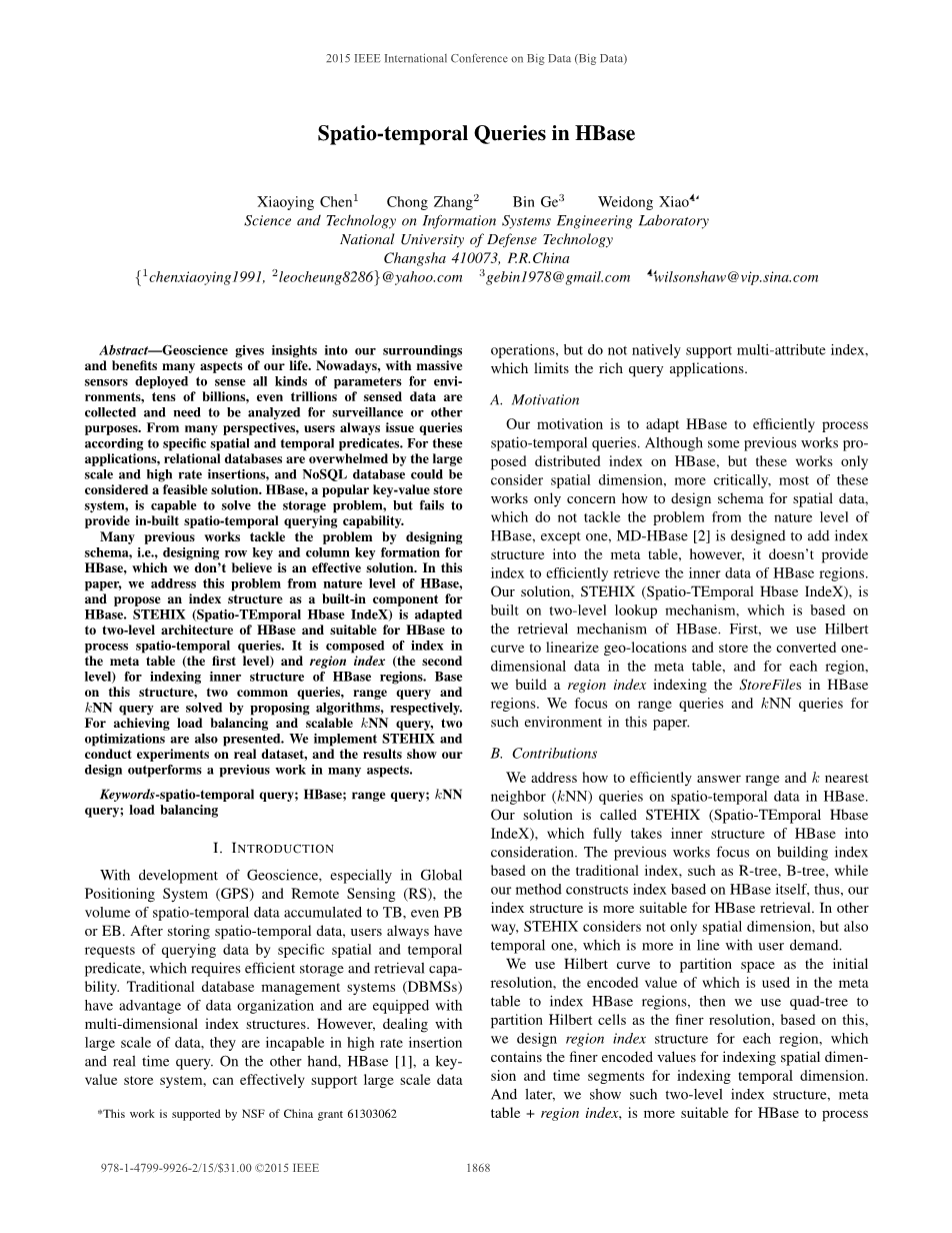 关键词:时空查询;HBase;范围查询;kNN查询;负载均衡
