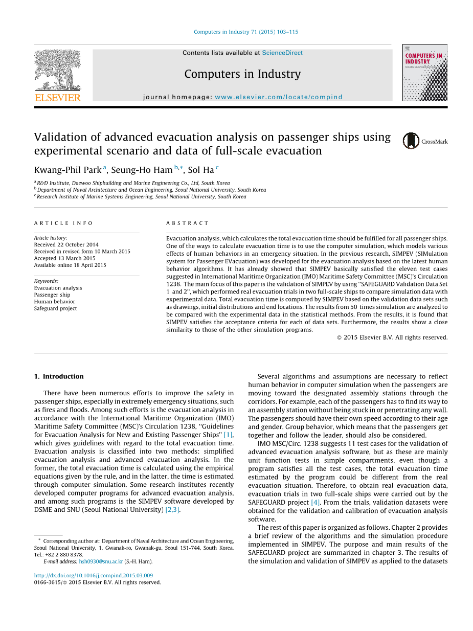 现在已经有很多措施来提高客轮的安全性,特别是在例如火灾和洪水这种紧急状况下。这些措施包括根据国际海事组织(IMO)和海事安全委员会(MSC)第1238号文件《新旧客轮疏散分析准则》进行的疏散分析。该文件对总疏散时间做出了规范。疏散分析包括简化疏散分析和高级疏散分析两种方法。前一种情况中总疏散时间是通过规则给出的经验公式计算:后一种情况中总疏散时间是通过计算机模拟估算。一些研究机构最近开发了用于高级疏散分析的计算机程序,其中包括由DSME和SNU(首尔国立大学)开发的SIMPEV软件。