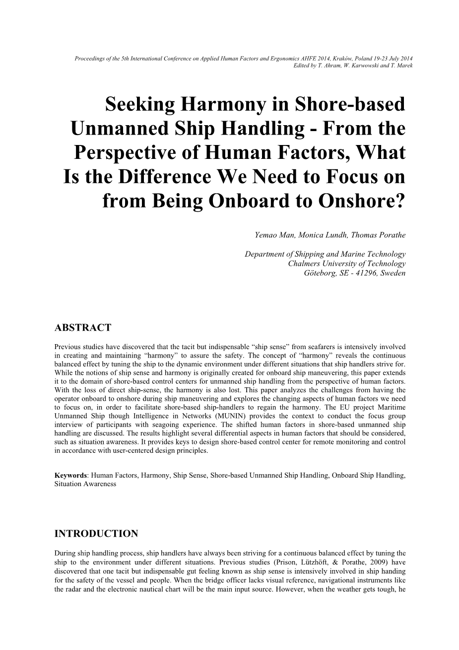 关键词:人为因素、和谐、船舶感知、岸基无人船舶操纵、基于船载的船舶操纵、态势感知