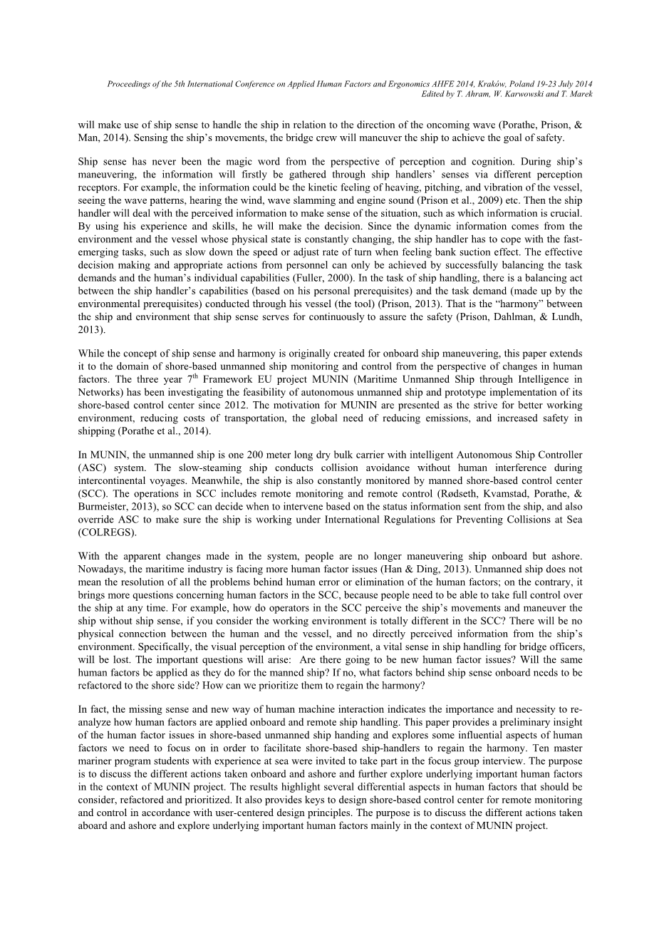 随着系统的明显变化,人们不再在船上操纵船舶,而是在岸上进行操纵。如今,航运业面临着更多的人为因素问题(Han amp; Ding, 2013)。无人驾驶船舶并不意味着解决了所有人为错误背后的问题或消除了人为因素;相反的,它在SCC中带来了更多关于人为因素的问题,因为人们需要能够在任何时候完全控制船舶。例如,如果你考虑到SCC中的工作环境是完全不同的,那么SCC中的操作员如何在没有船舶感知的情况下感知船舶的运动和操纵船舶呢?人与船之间没有物理联系,也没有来自船舶环境的直接感知信息。具体来说,驾驶室操作的船员在船舶操作中的重要感觉,即环境的视觉感知,将会丧失。重要的问题将会出现:是否会出现新的人为因素问题?人为因素会像载人船船一样被应用吗?如果没有,船上的船舶感知背后的什么因素需要重构到岸上?我们如何优先处理它们以重新获得和谐?