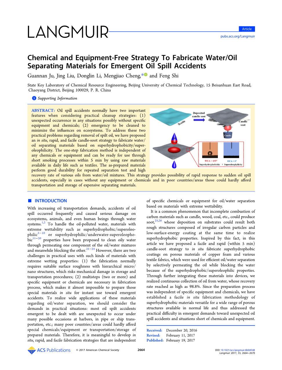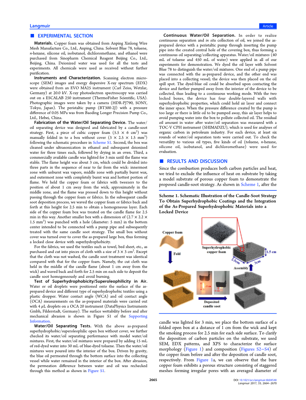 特殊用途专用化学品或油水分离设备,以极具润湿性的材料为基础。不完全燃烧是一种普遍现象。碳材料,如蜡烛、木材、煤等,都可以生产,25 26其在基片上的沉积可能导致粗糙结构由不规则的碳颗粒和低表面能涂层组成,同时具有良好的疏水性。受此启发,本文提出了一种简便、快速(5 分钟内)蜡烛烟策略,在泡沫铜和耐火材料多孔材料上原位制备超疏水涂层。由于超疏水/超亲油特性,可选择性渗透油/水,用于专门油水分离。采用连续法从水中收集油,回收率高达98.8%。由于制备过程不依赖于特殊的专用设备和化学品,我们建立了一种简便的超疏水材料的现场制造方法,适用于正常生活中广泛存在的多孔结构,从而解决了对意外油污事故和缺少化学品和设备的紧急需求的实际需要。